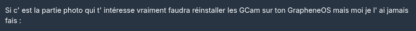 Mais sur GrapheneOS tu peux installer l'application caméra de Google et dans ce cas tu auras la qualité normale des Pixel