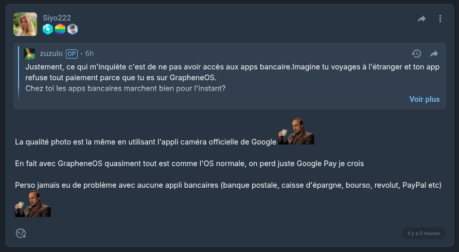 Tant que tout ça fonctionne j' aurai toujours un smartphone sous GrapheneOS, si Google commence foutre le bordel avec ses API de sécurité Play Store rendant ces apps impossibles faudra aviser à ce moment là