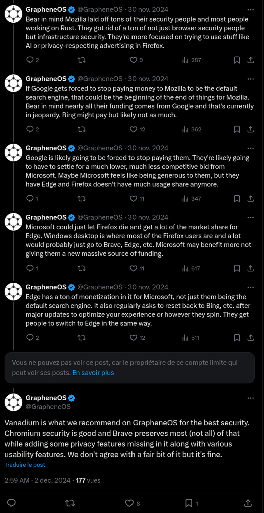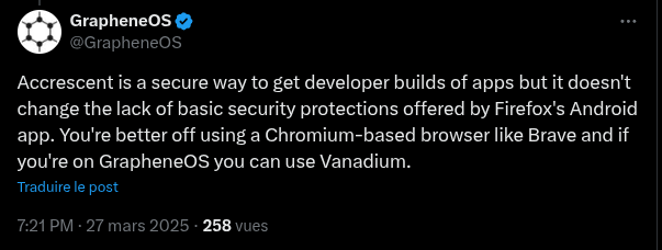 Marrant que tu critique Brave en encensant GrapheneOS alors que GrapheneOS eux-mêmes déconseillent absolument Firefox et disent que Brave est le seul autre navigateur qu'ils recommandent en dehors de Vanadium (qui est le navigateur de GrapheneOS)