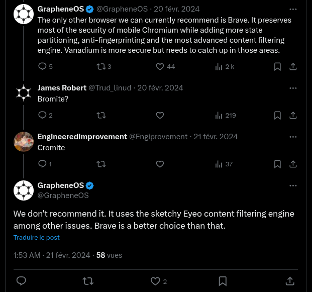 En gros ce qu'ils disent plusieurs fois sur leurs Twitter, c'est que Vanadium est plus sécurisé et que c'est le navigateur qu'ils recommendent pour les utilisateurs de GrapheneOS