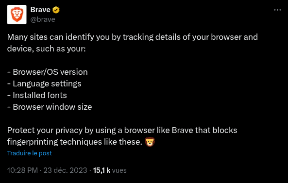 Si tu as configuré Brave en français, rien que ça ça diminue de beaucoup les possibilités. L'user agent de ton navigateur dit déjà beaucoup.