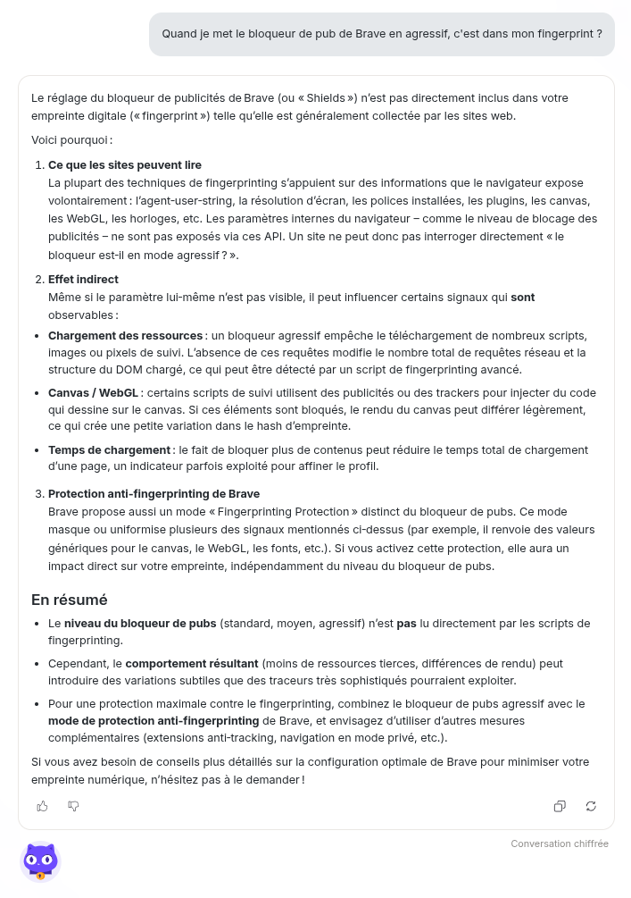 Mais en fait on est forcément unique avec Brave puisque ton empreinte est randomisé, le principe c'est que tous les sites web que tu visites aient une empreinte différente pour pas qu'on puisse te tracker, tu peux installer un Brave tout propre sans extension sans changer le moindre paramètre, tu seras unique c'est le principe