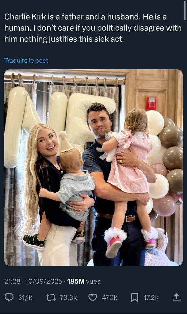 sauf que ça, c'est faux, inventé de toutes pièce, car charlie Kirk n'as pas été assassiné par la gauche et comme j'ai dis sur d'autre post