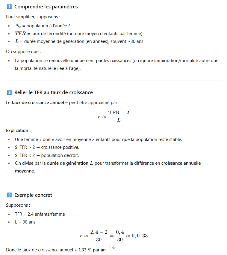 Sachant qu'il faut 2 enfants par femme pour un nombre de population stable, Voici la formule pour les matheux du forum. Mais ce qu'il faut retenir
