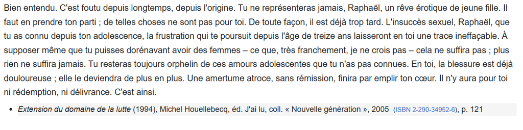 c'est une véritable aubaine pour les hommes comme moi, c'est une raison supplémentaire pour laquelle il n'y a pas de fatalité, donc non je ne suis pas hors stat du forum d'un point de vue physique, mais comme je l'ai dit ce n'est pas une fatalité d'un point de vue relations, à partir du moment où tu comprends comment fonctionne le "marché", ou la psychologie féminine pour le dire de manière plus élégante, et que par ailleurs tu n'es pas fataliste etc...