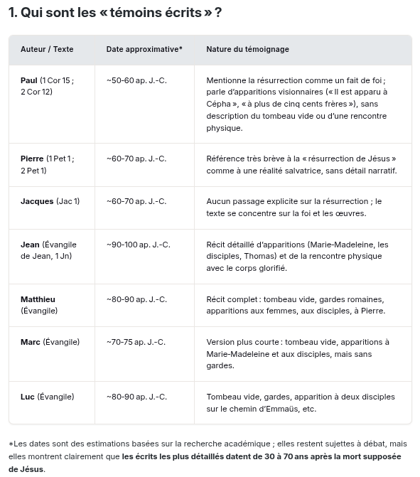 1 Cor 15 3‑8 énumère les personnes à qui Jésus serait apparu, sans décrire le tombeau vide, les gardes ou une rencontre physique.