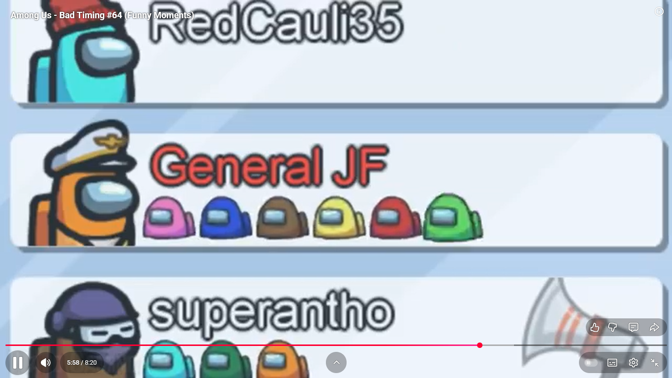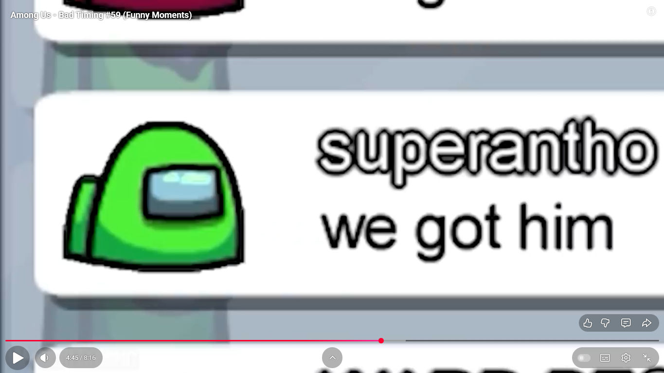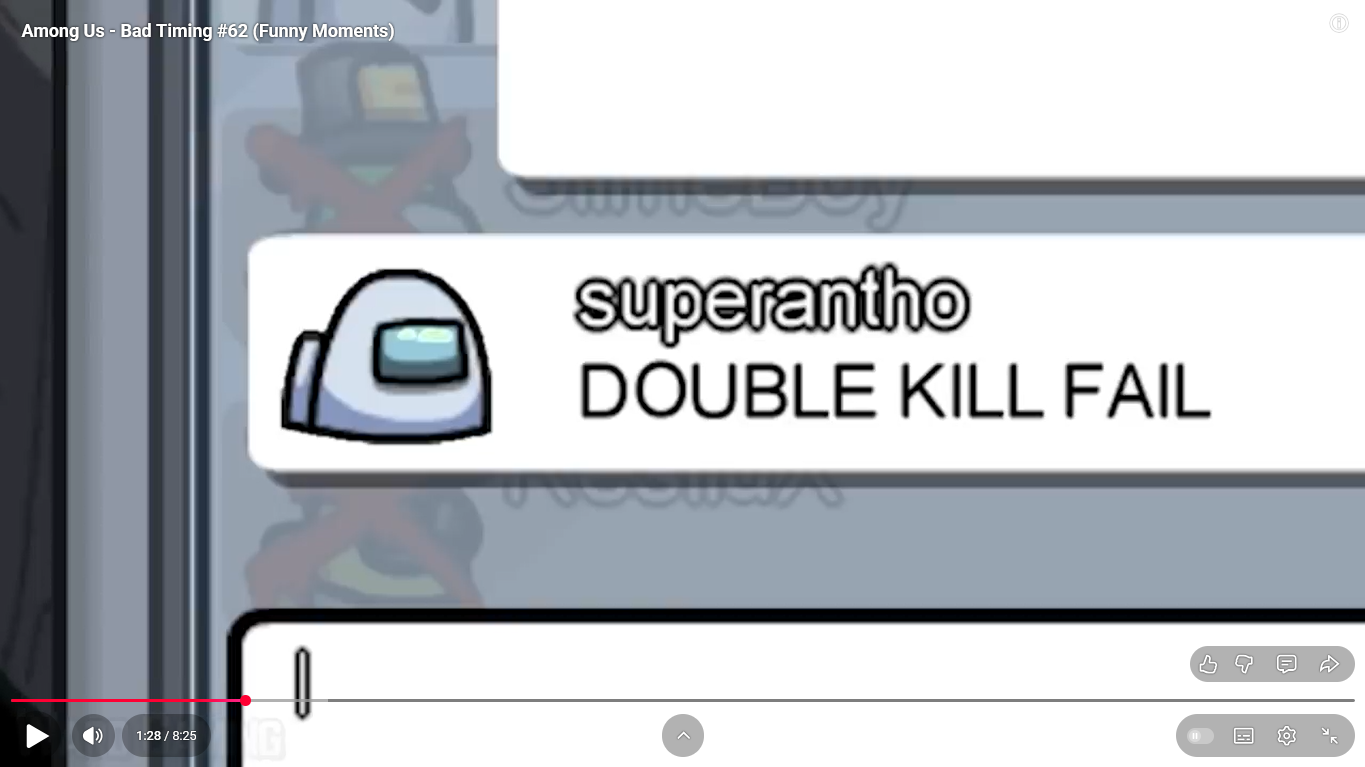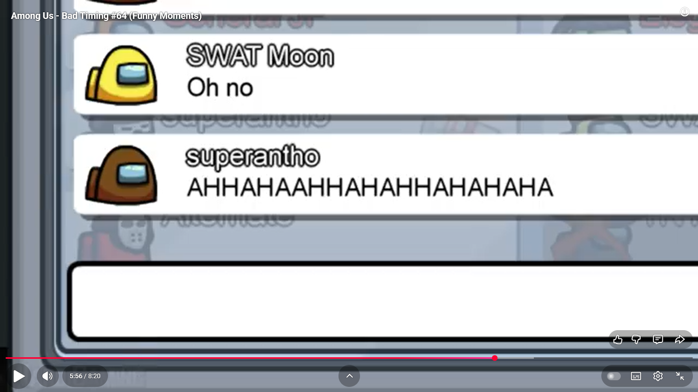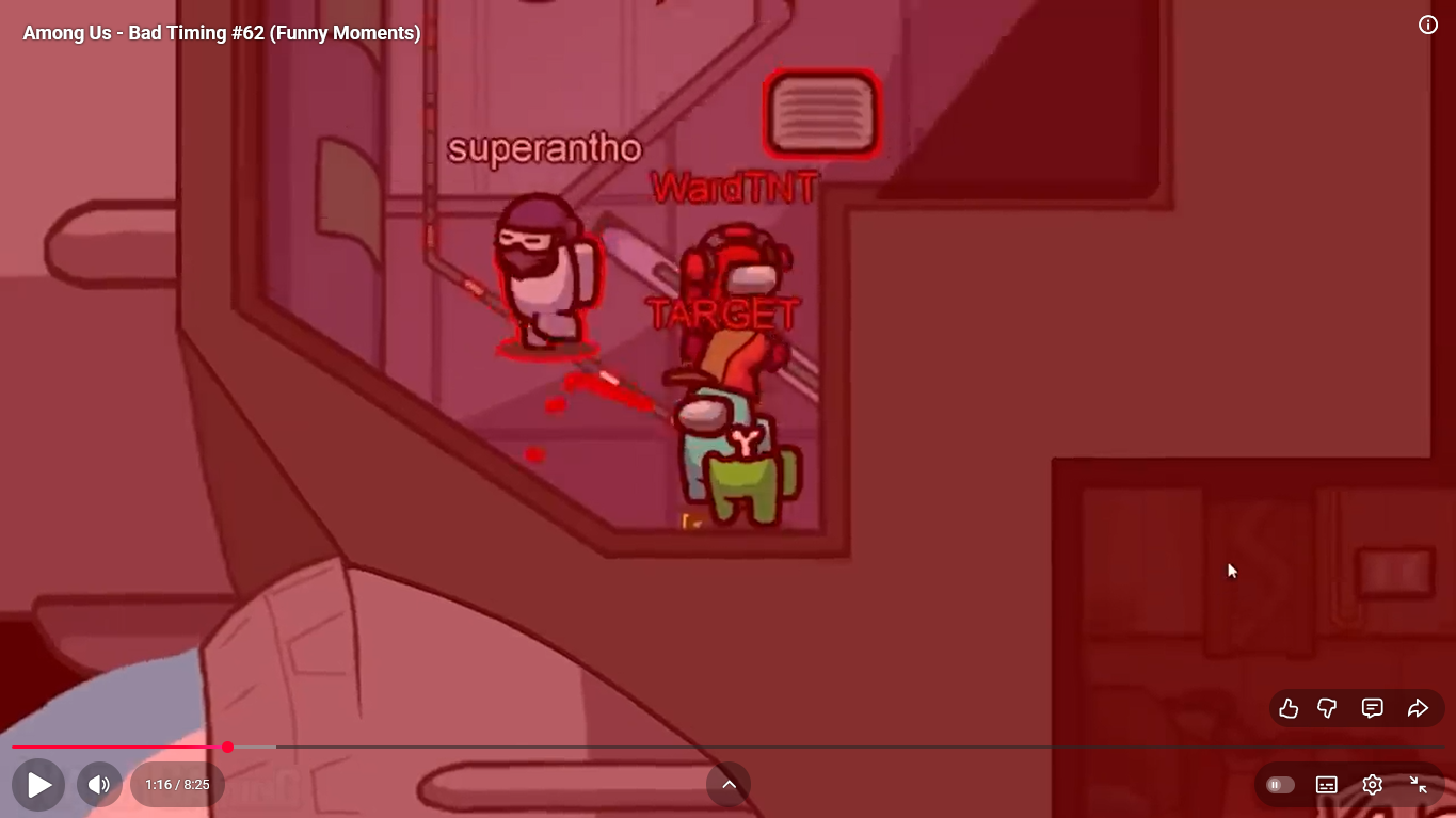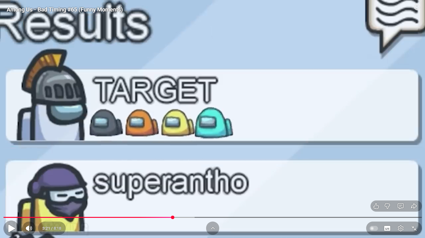 https://www.youtube.com/watch?v=FDgC5k4vH5s Among Us - Bad Timing #117 (Funny Moments) Superantho et Target 8 minutes.
