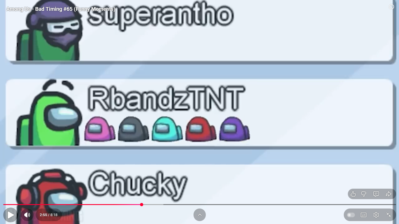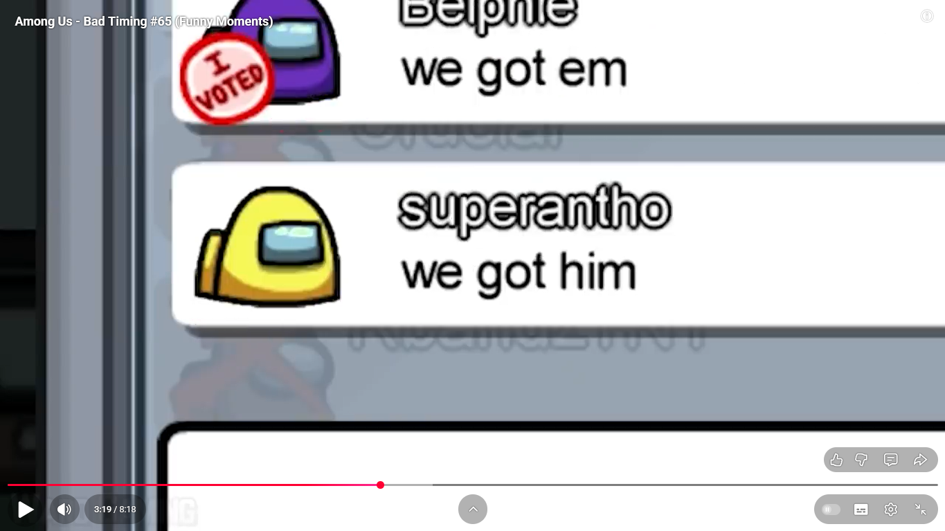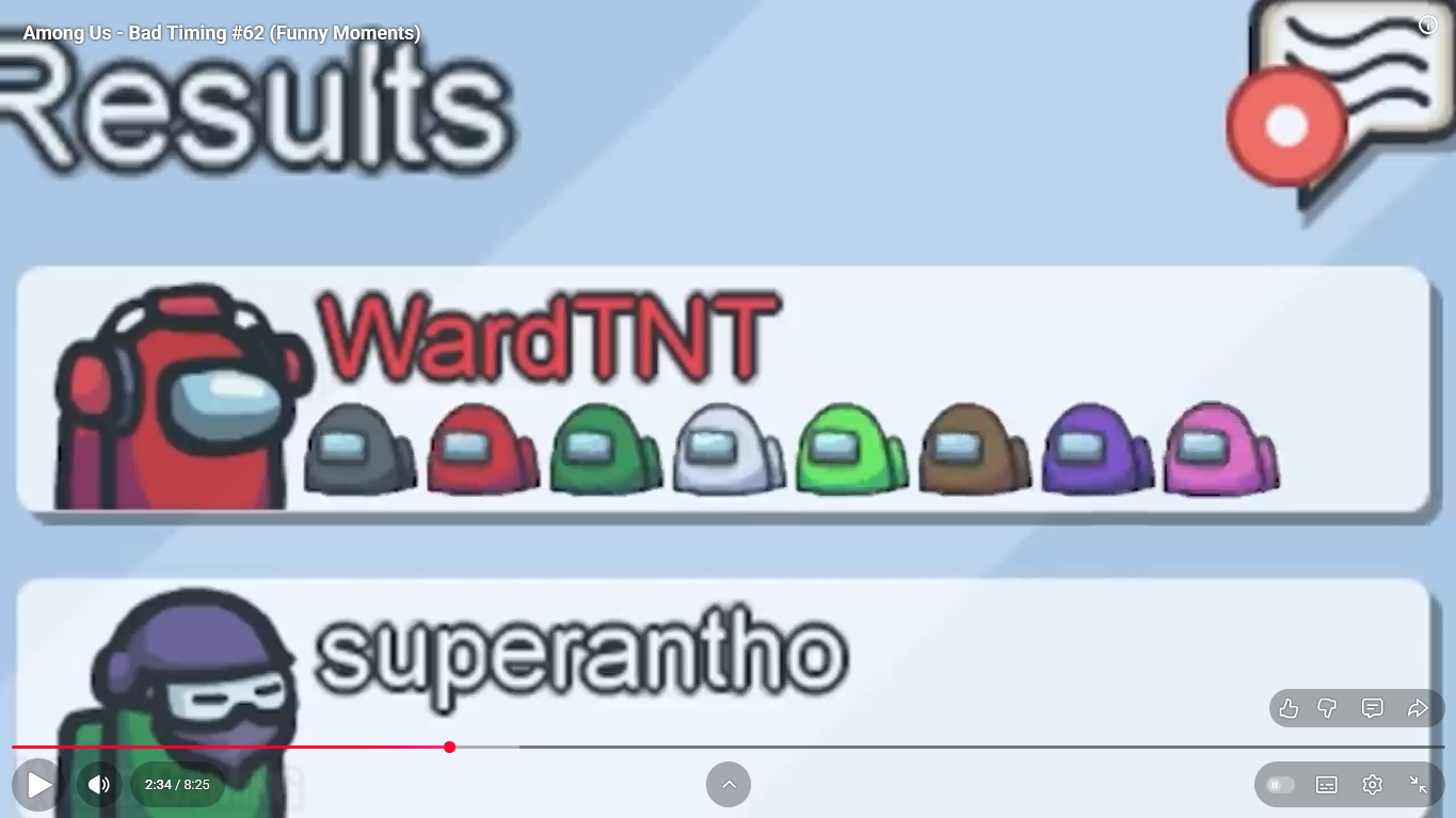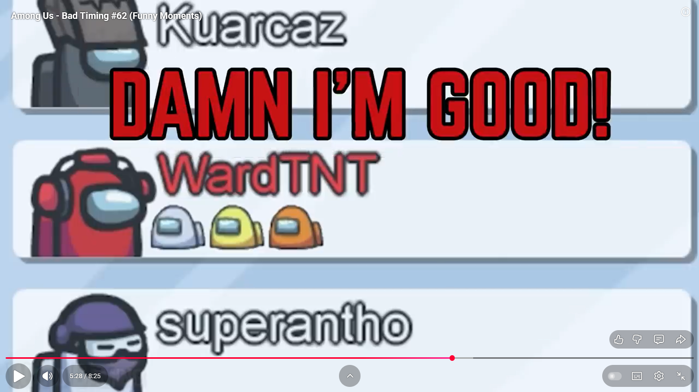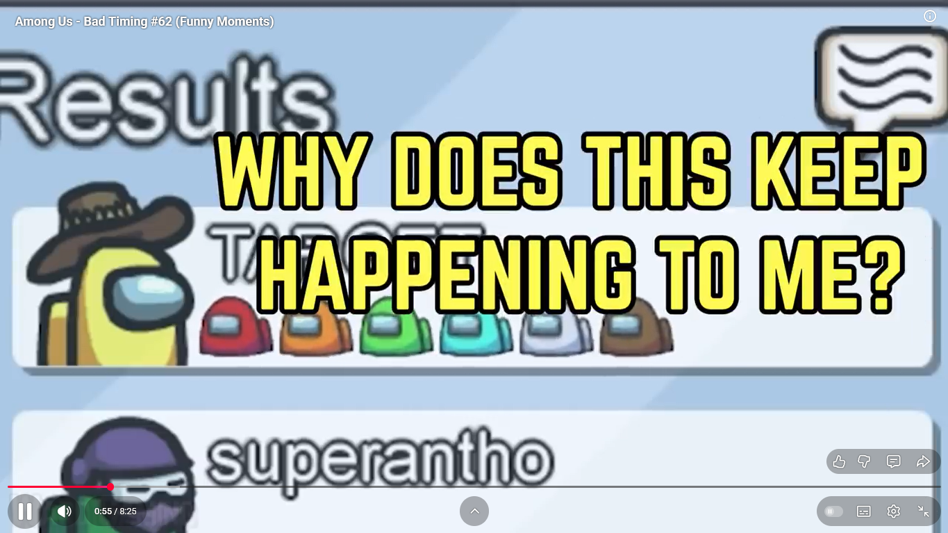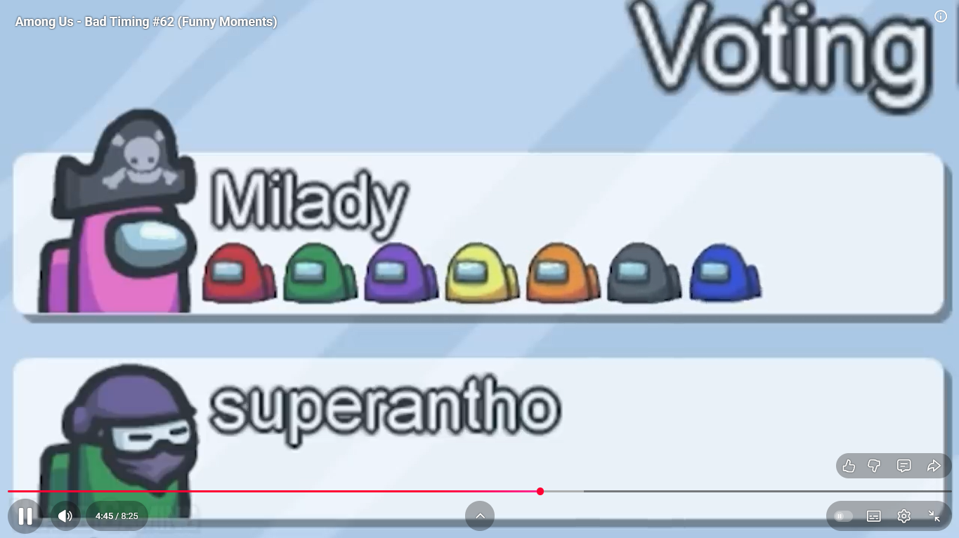 https://www.youtube.com/watch?v=FDgC5k4vH5s Among Us - Bad Timing #117 (Funny Moments) Superantho et Target 8 minutes.