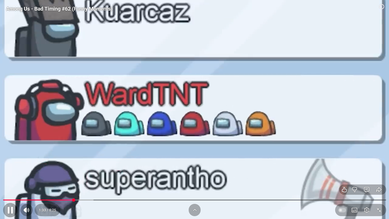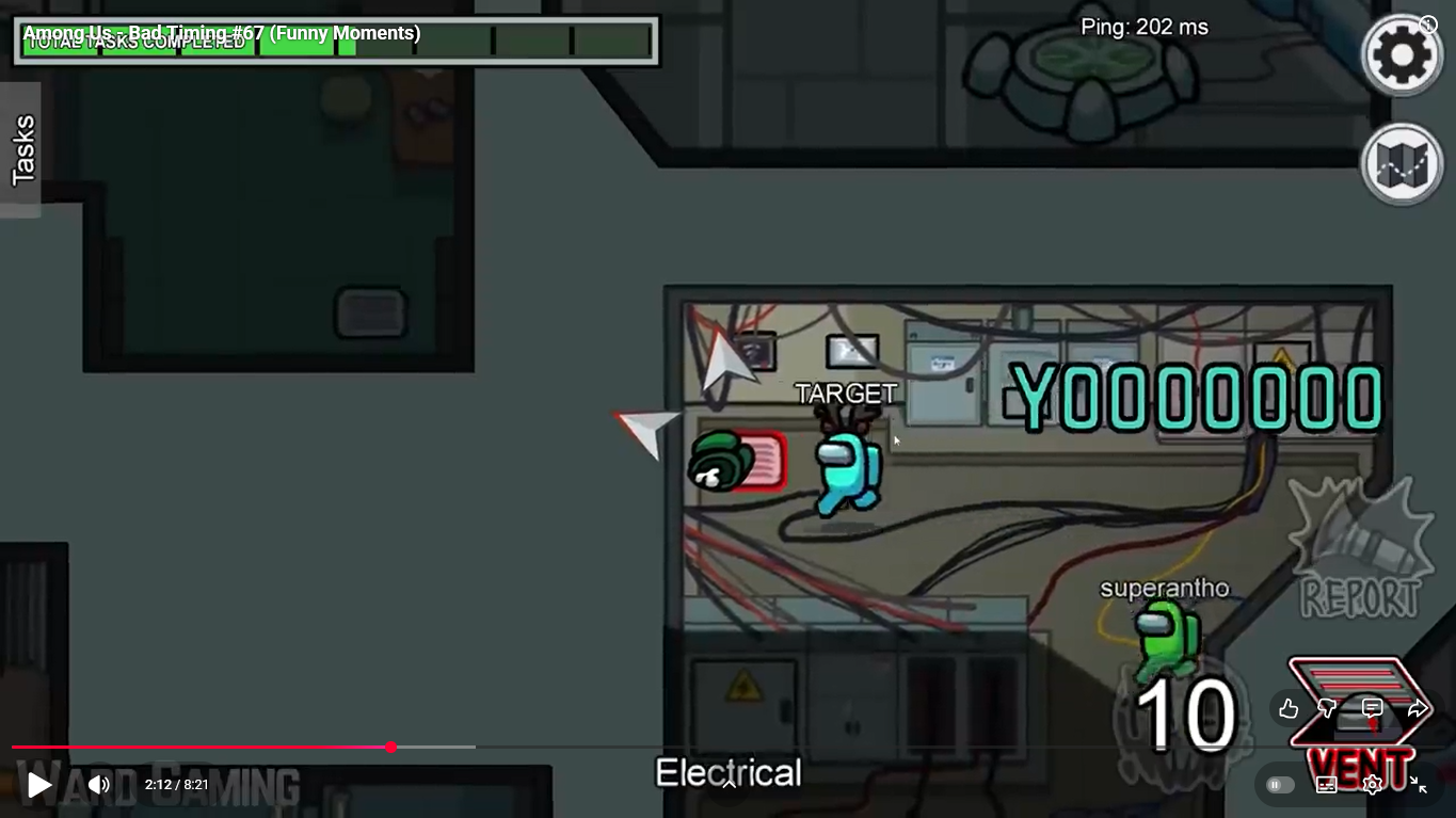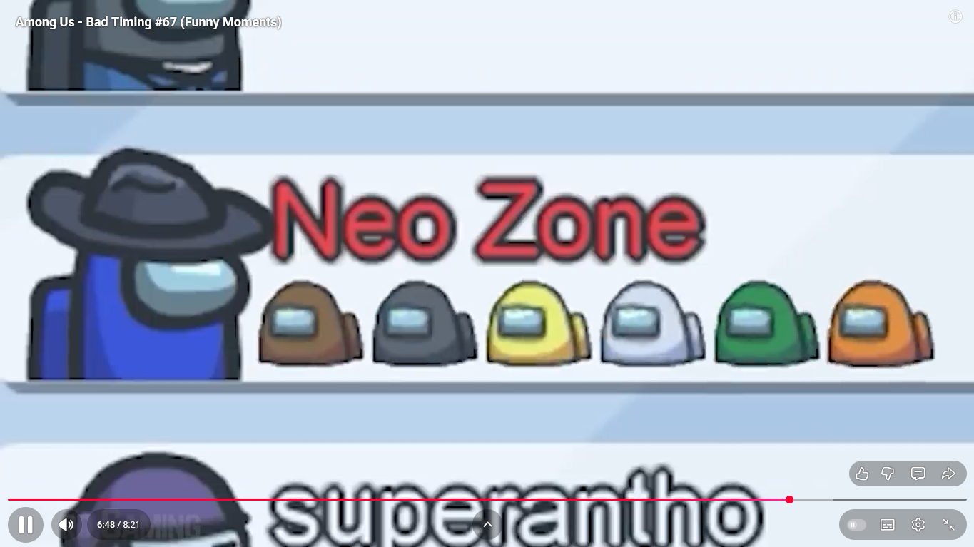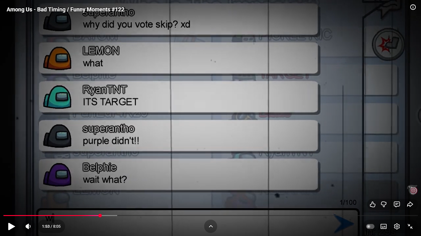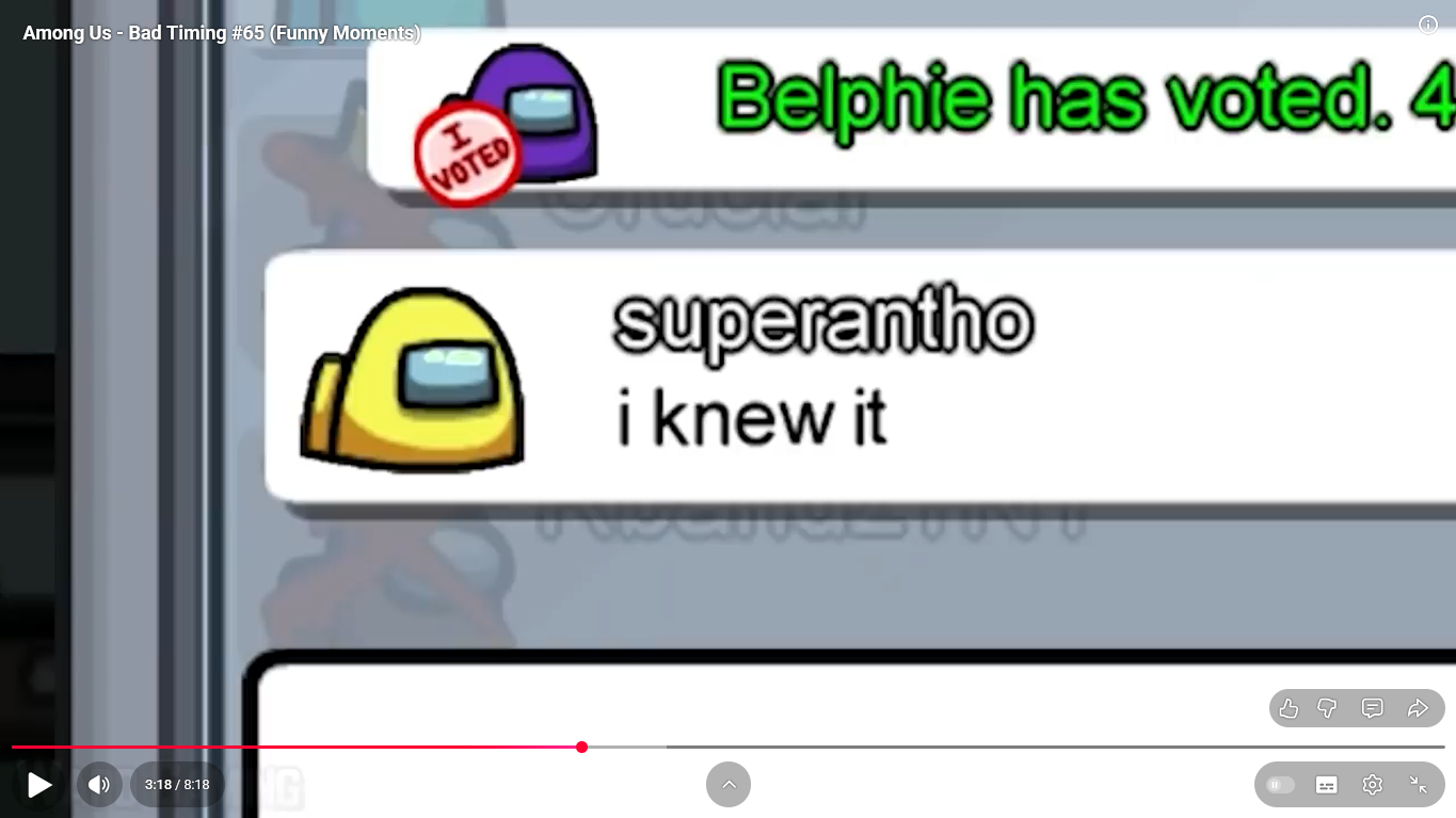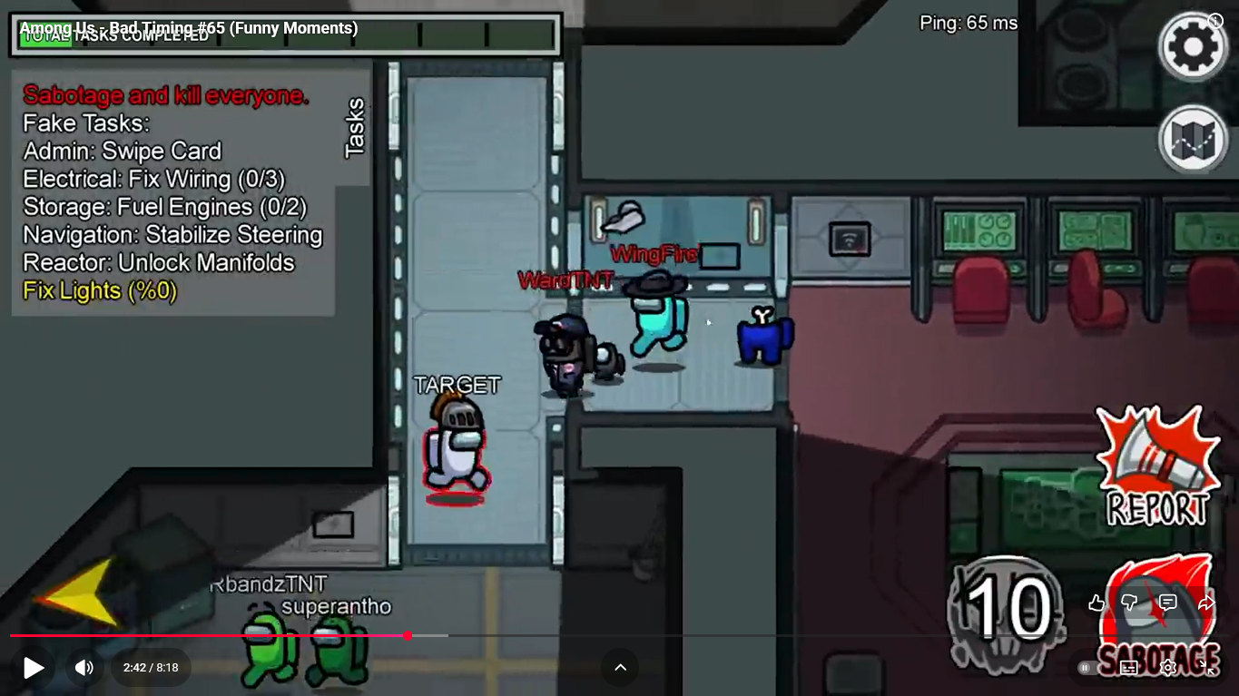 https://www.youtube.com/watch?v=FDgC5k4vH5s Among Us - Bad Timing #117 (Funny Moments) Superantho et Target 8 minutes.