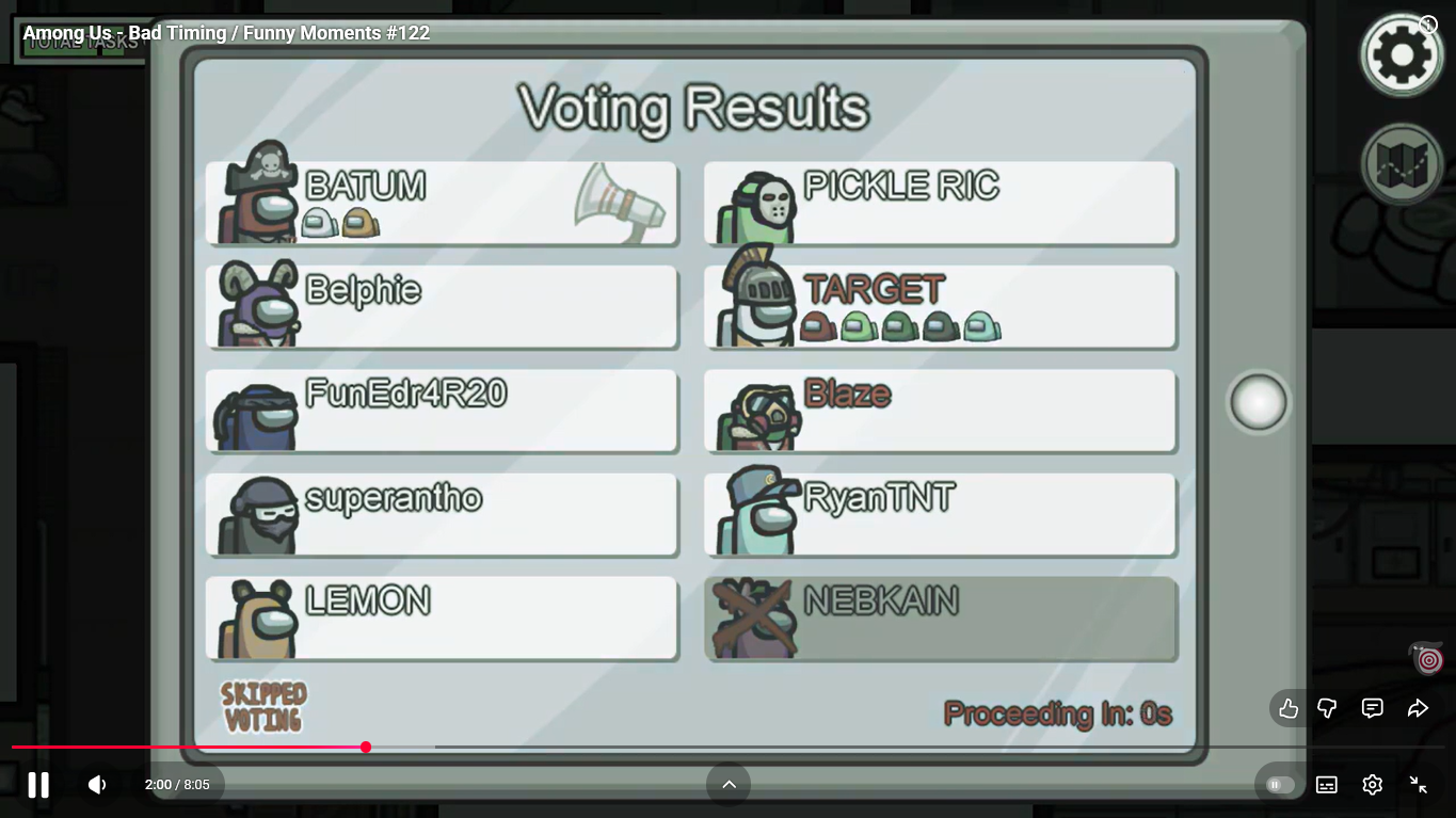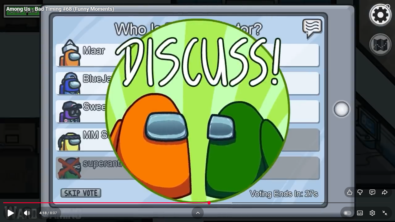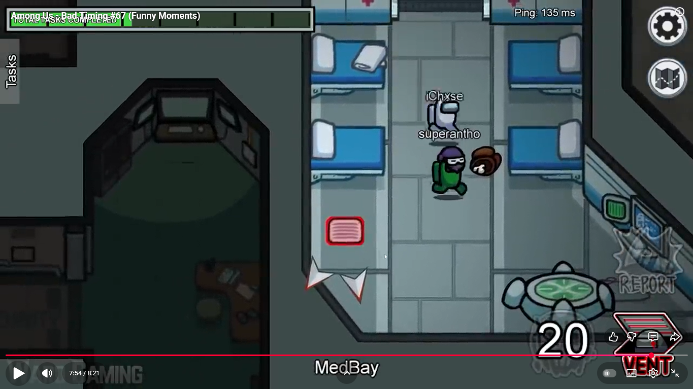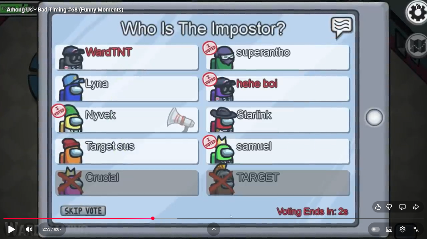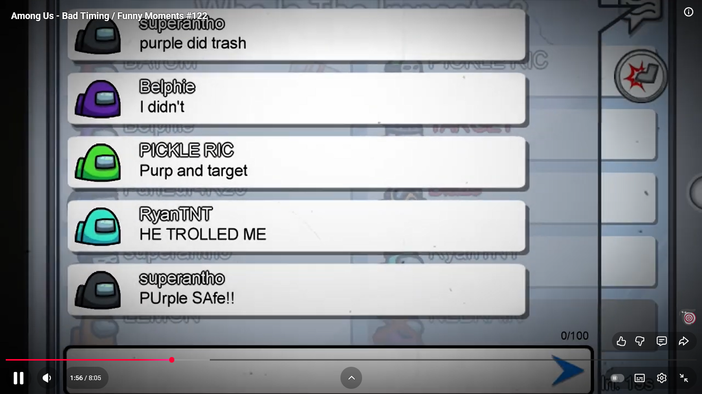 https://www.youtube.com/watch?v=FDgC5k4vH5s Among Us - Bad Timing #117 (Funny Moments) Superantho et Target 8 minutes.