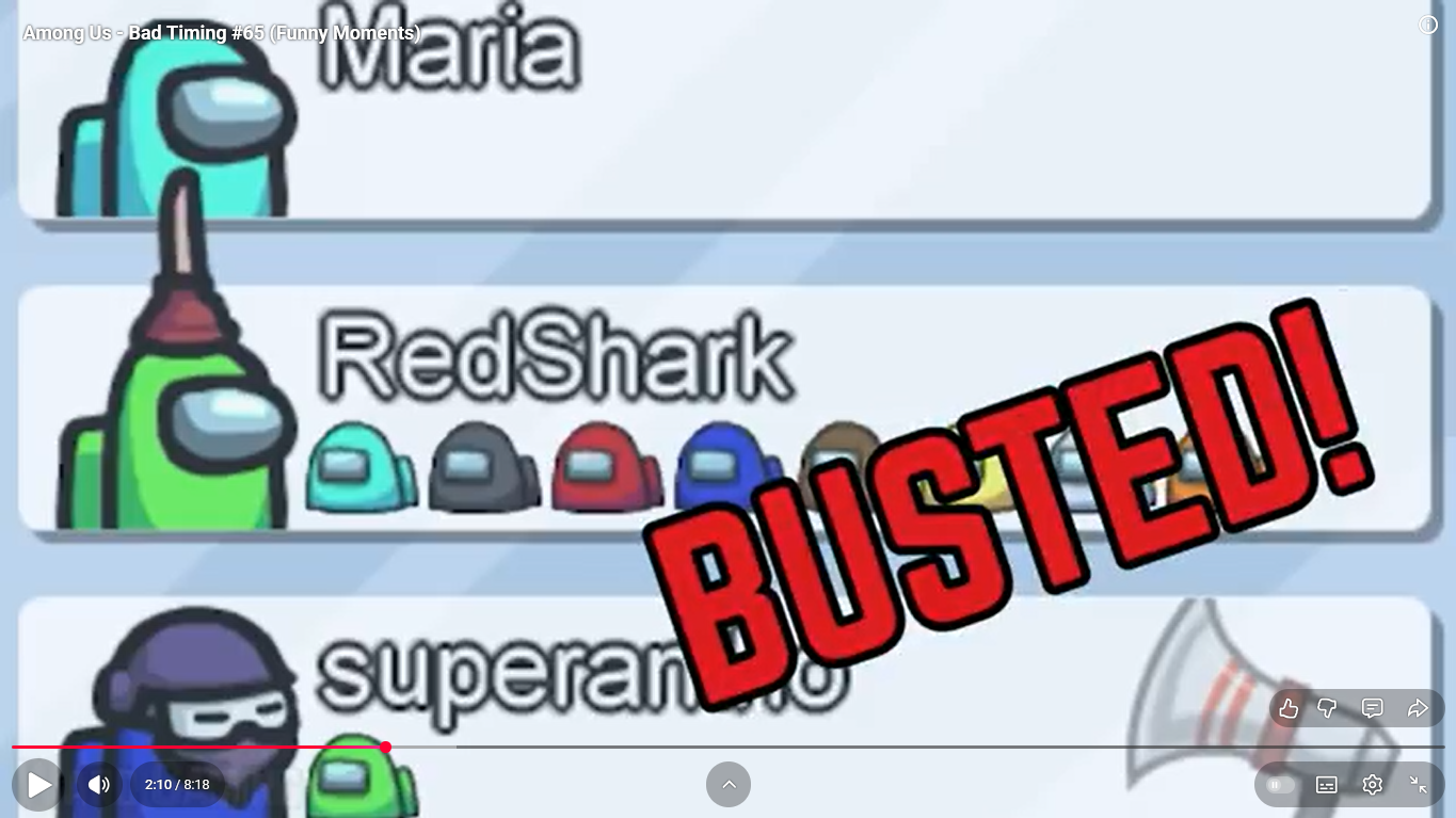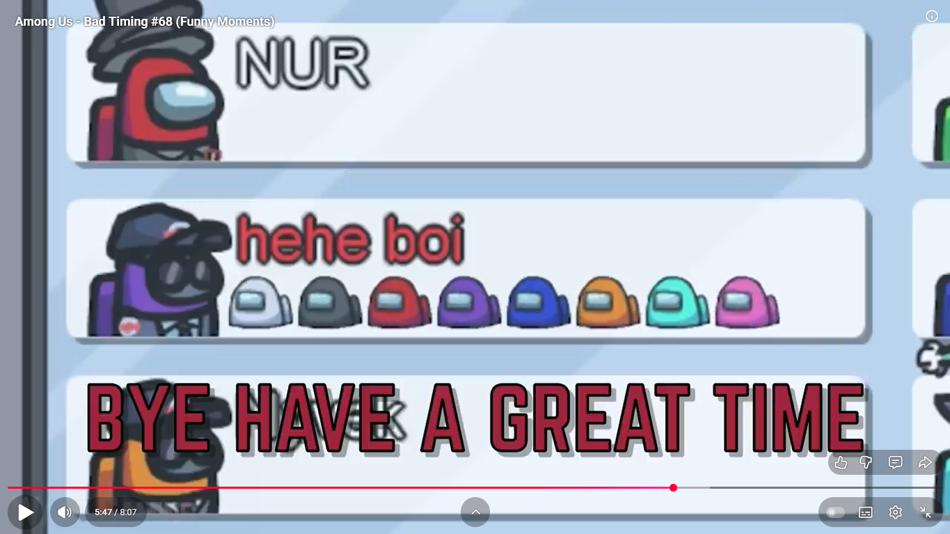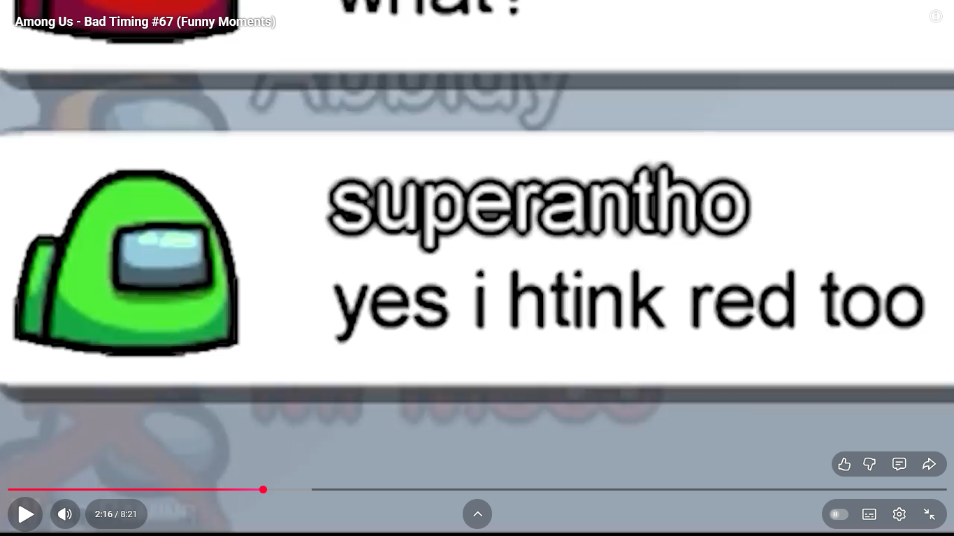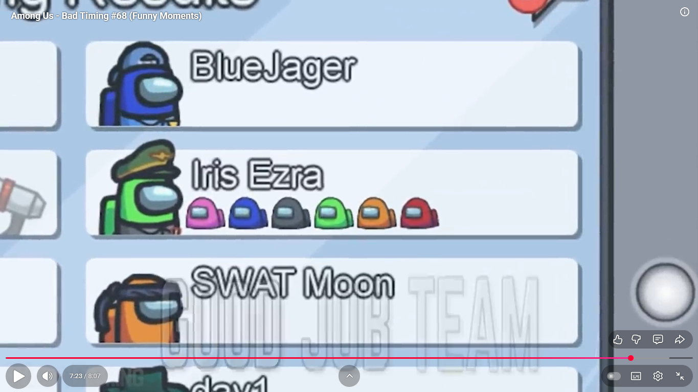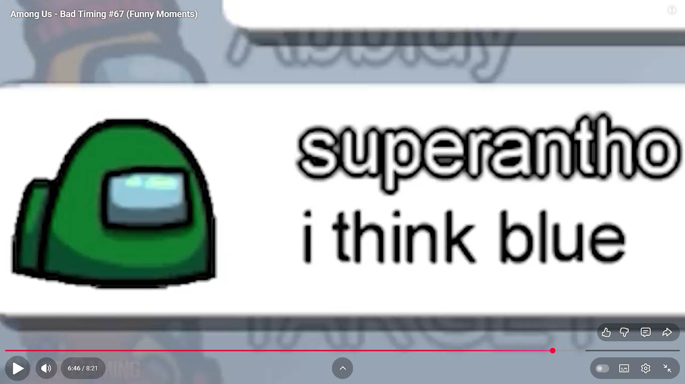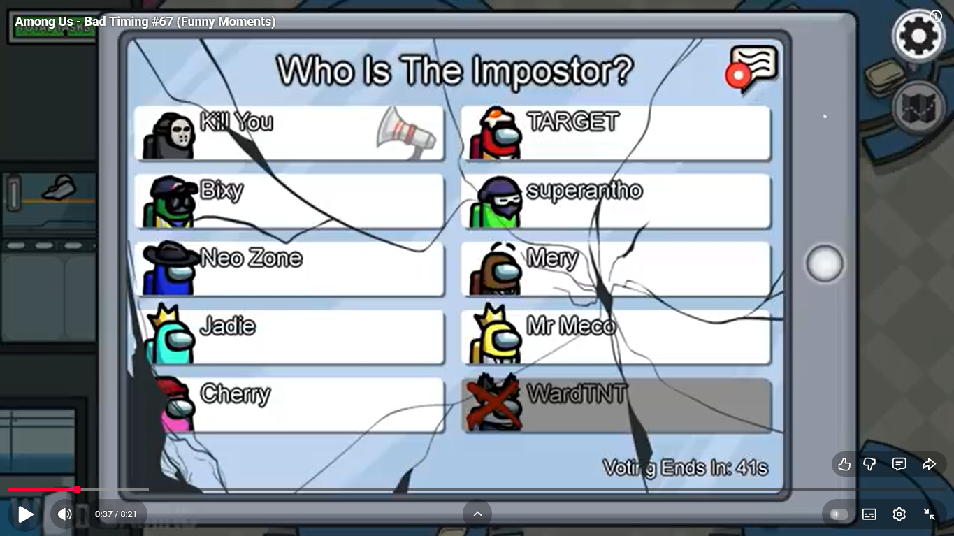 https://www.youtube.com/watch?v=FDgC5k4vH5s Among Us - Bad Timing #117 (Funny Moments) Superantho et Target 8 minutes.