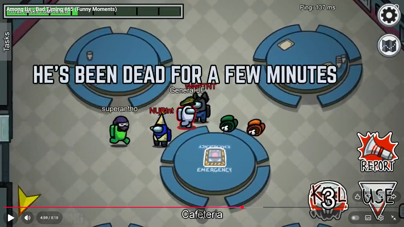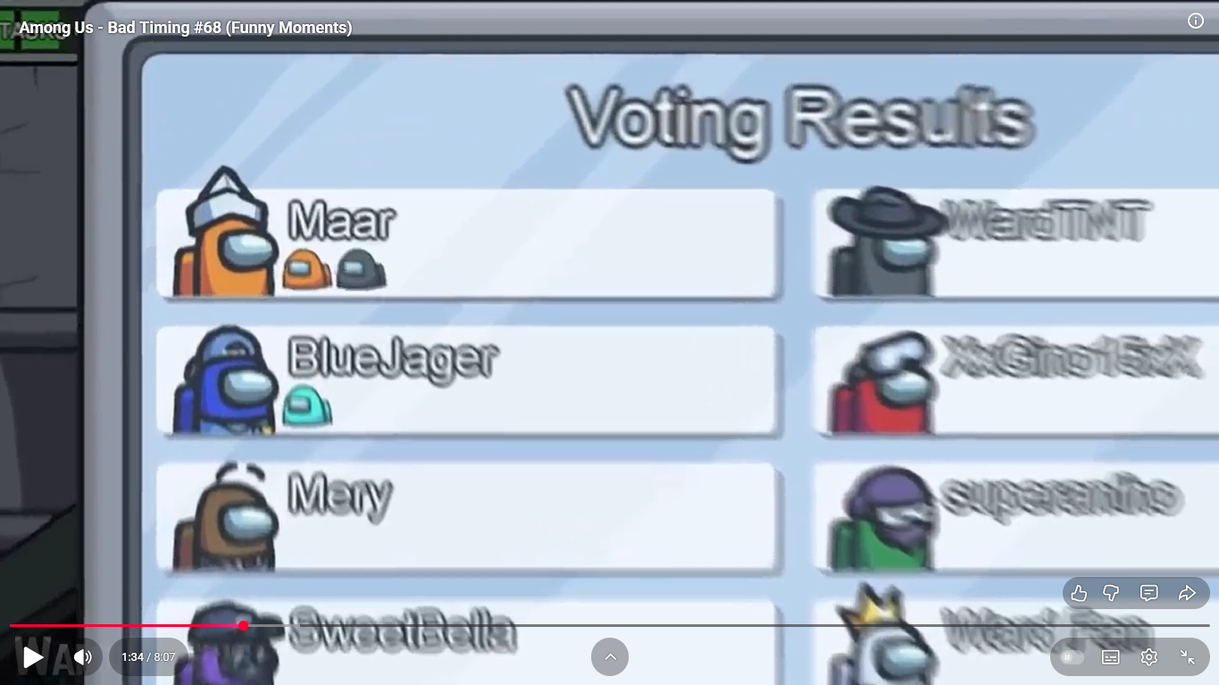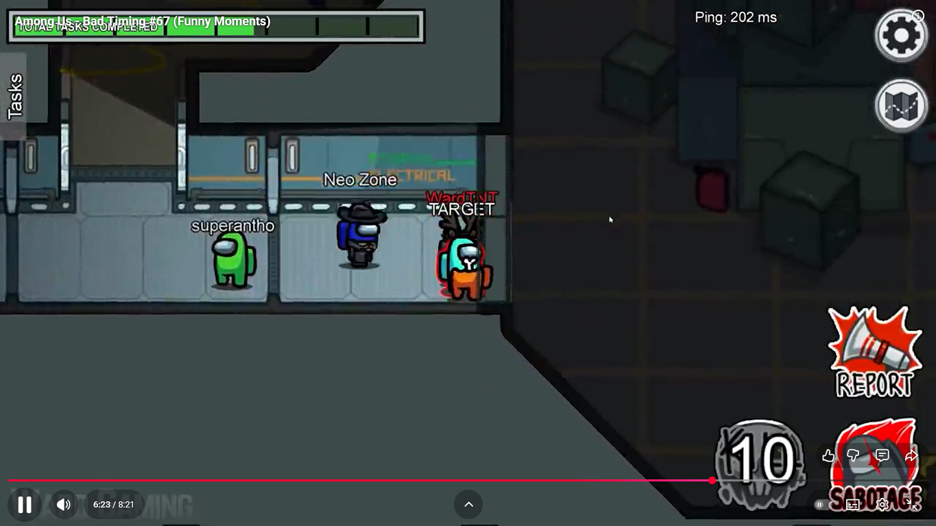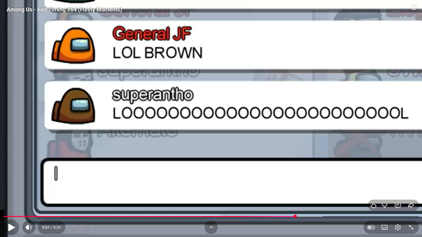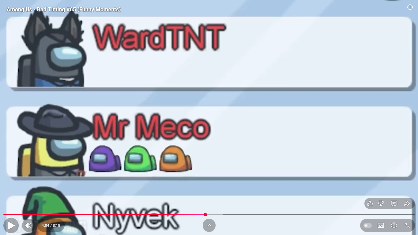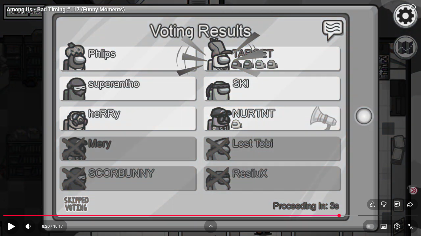 https://www.youtube.com/watch?v=FDgC5k4vH5s Among Us - Bad Timing #117 (Funny Moments) Superantho et Target 8 minutes.