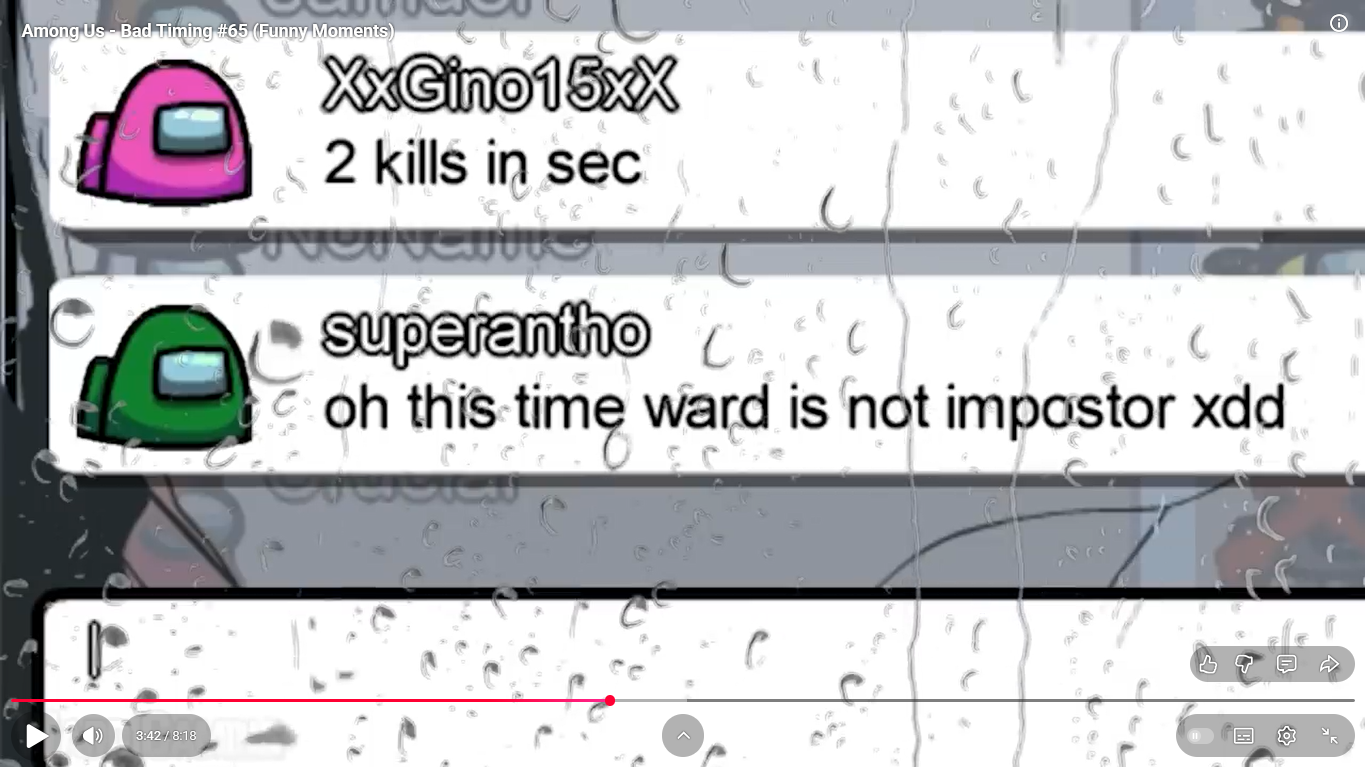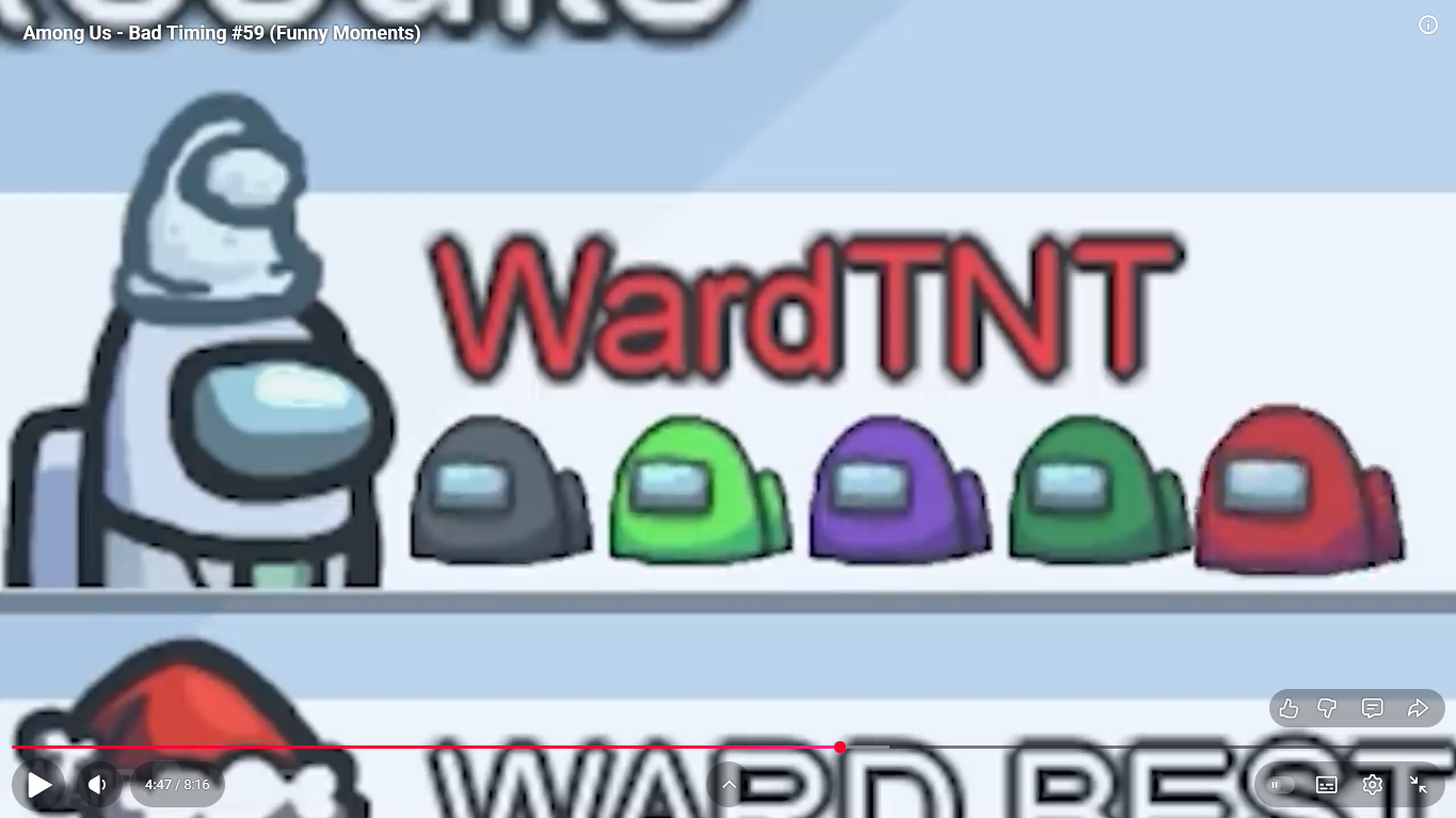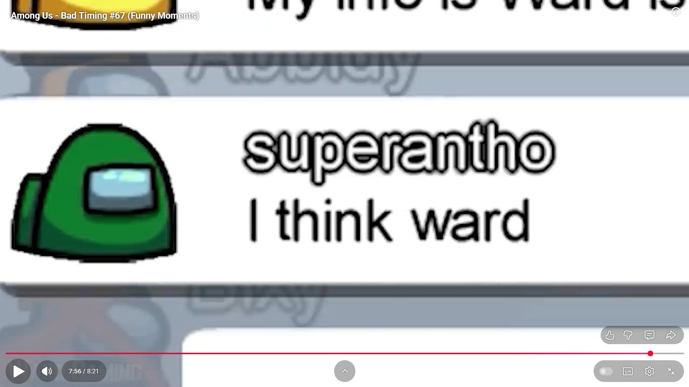 https://www.youtube.com/watch?v=oK2wKo8yMWc Among Us - Bad Timing #68 (Funny Moments) 1 minute 00 ward et moi imposteur ( je suis mort ) superantho
