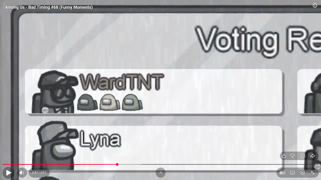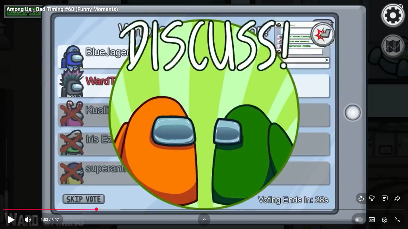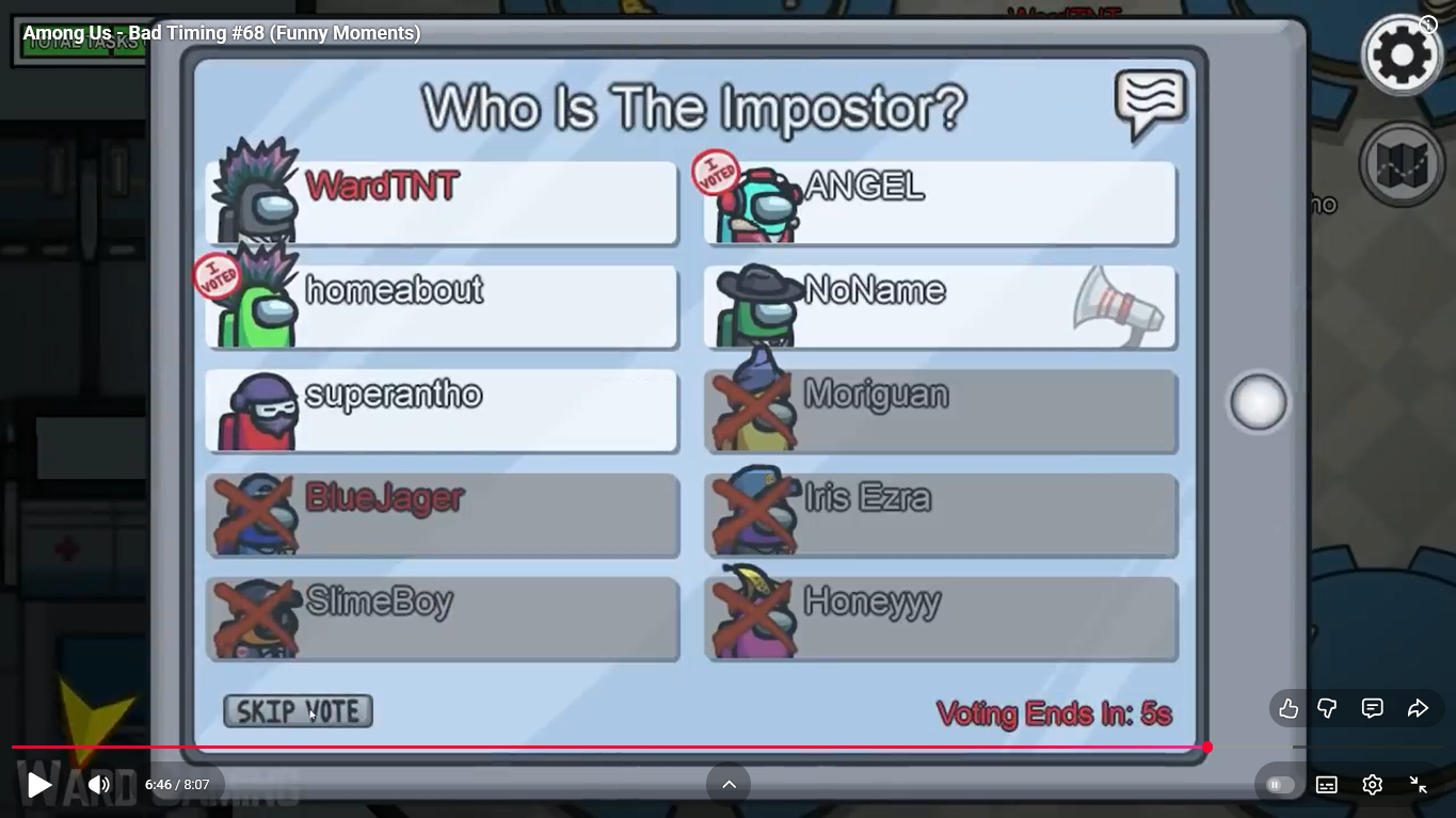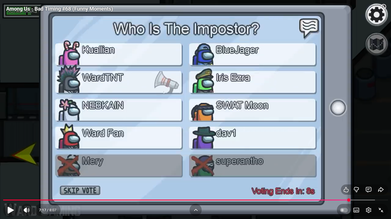 https://www.youtube.com/watch?v=oK2wKo8yMWc Among Us - Bad Timing #68 (Funny Moments) 1 minute 00 ward et moi imposteur ( je suis mort ) superantho