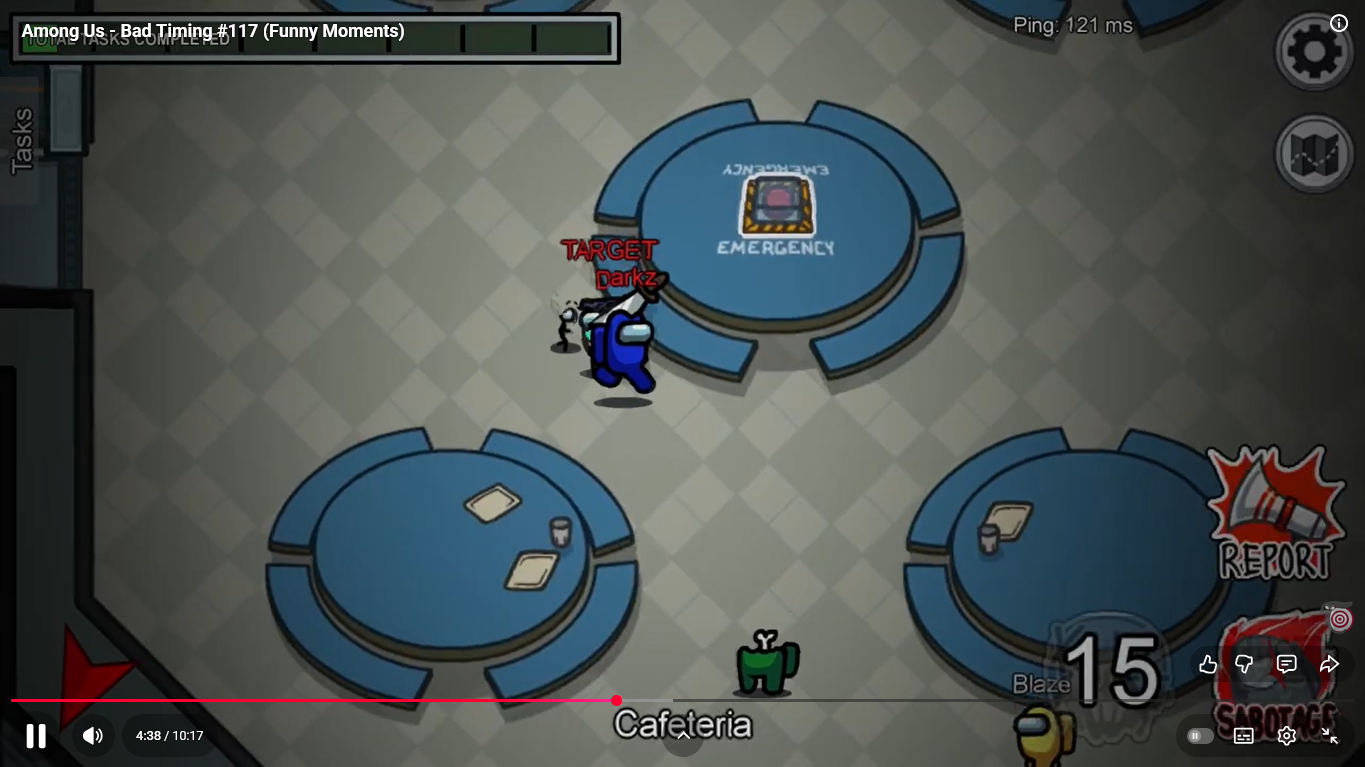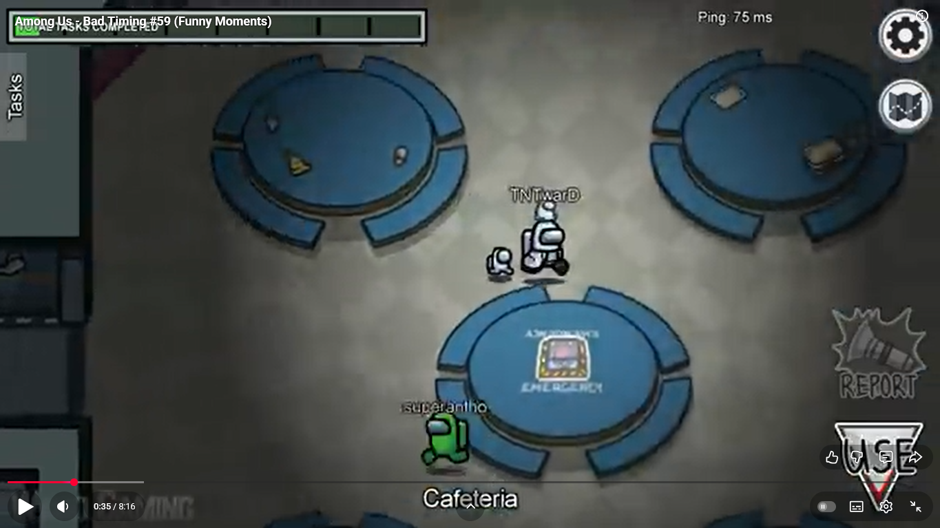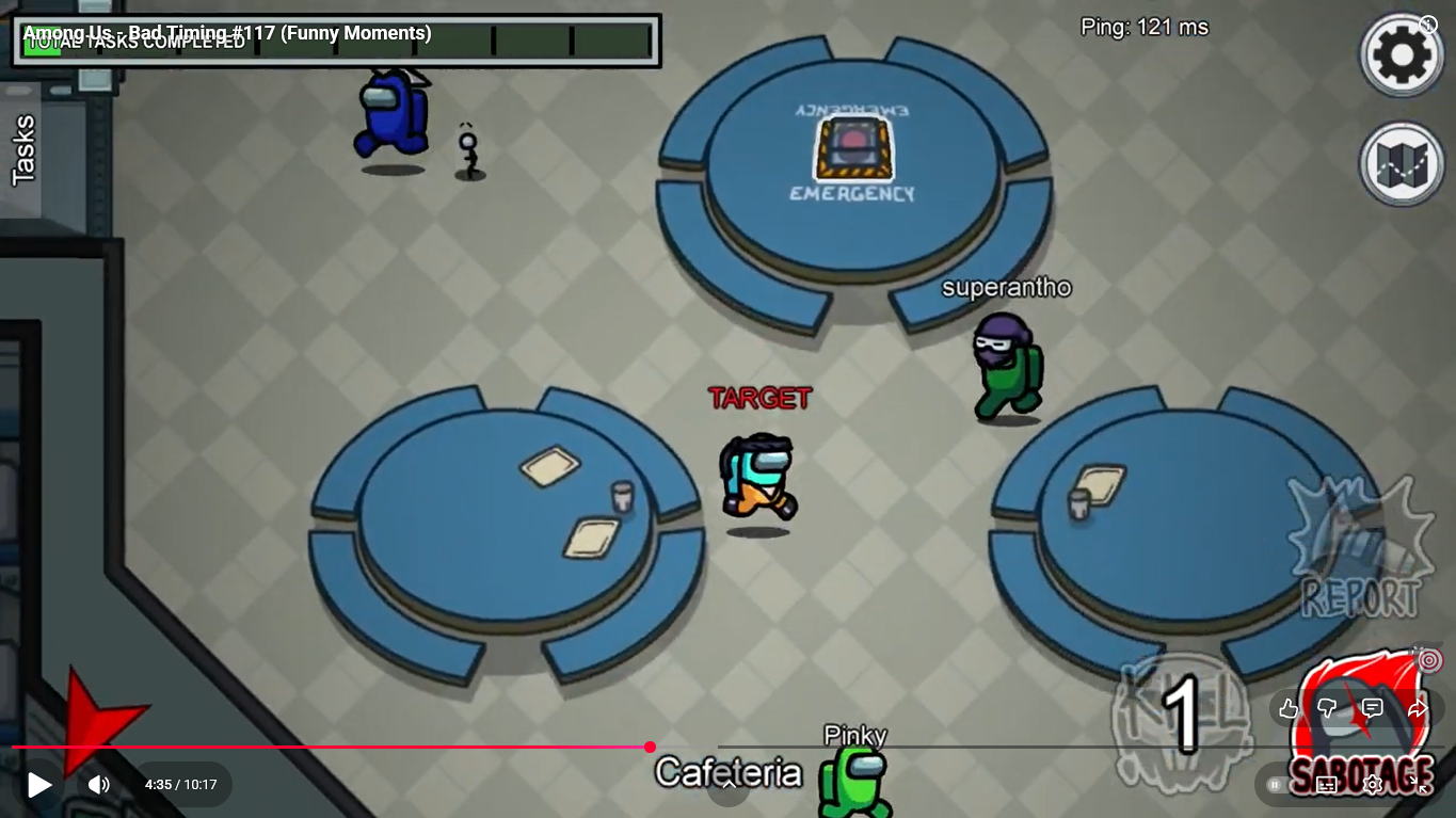 https://www.youtube.com/watch?v=69JD_GXd7L0 Among Us - Bad Timing / Funny Moments #122 Superantho et Target 1 minute 50.
