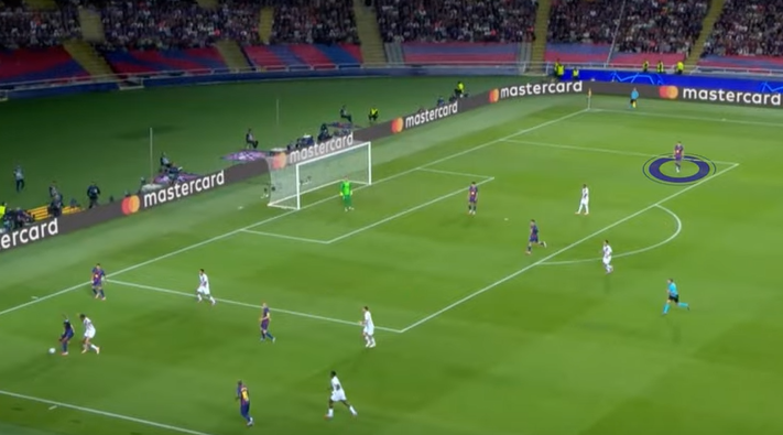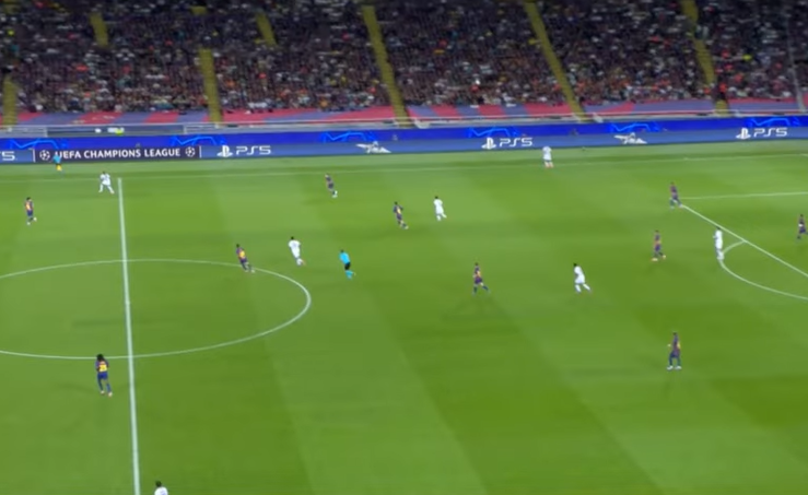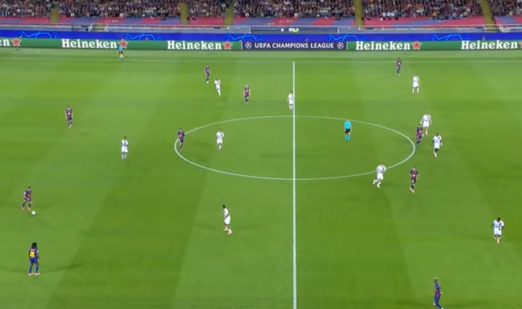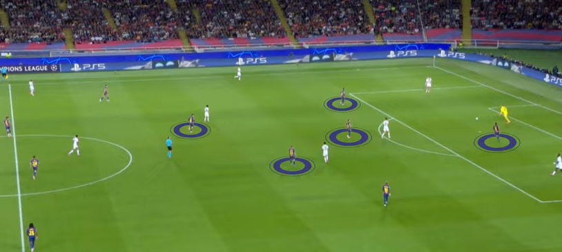 They now have a clear advantage but Barcelona do the same thing. The team switch from zonal to man marking as soon as the pass to the goalkeeper is triggered.