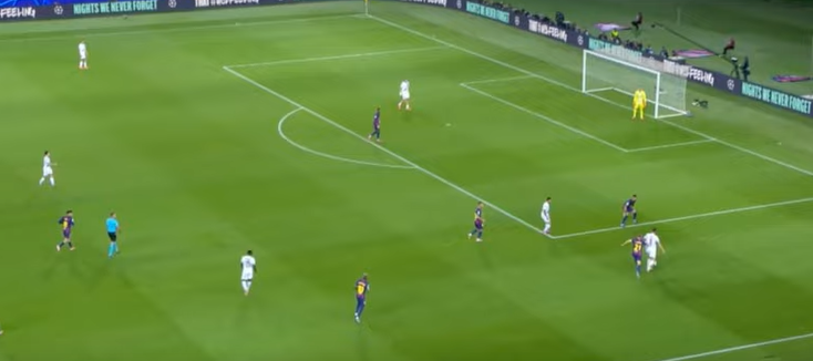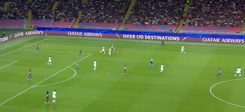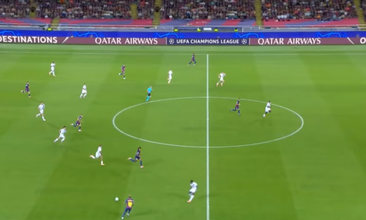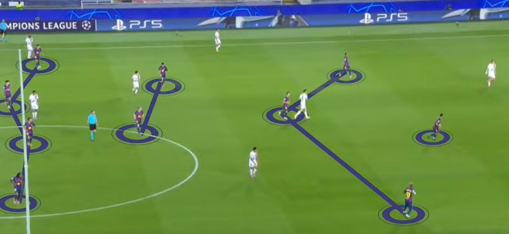 It means PSG can move into midfield and force Barcelona back into a zonal marking system. Having the fullbacks stay wide helps circulate possession around the back and opens these pockets of space in the center for the 2 pivots to get on the ball. Something we see consistently both at Barcelona and PSG. And if the opposition gets to aggressive clowing down the fullbacks, then it opens up these 2 gaps mentionned earlier : in front of othe defense, or in behind.