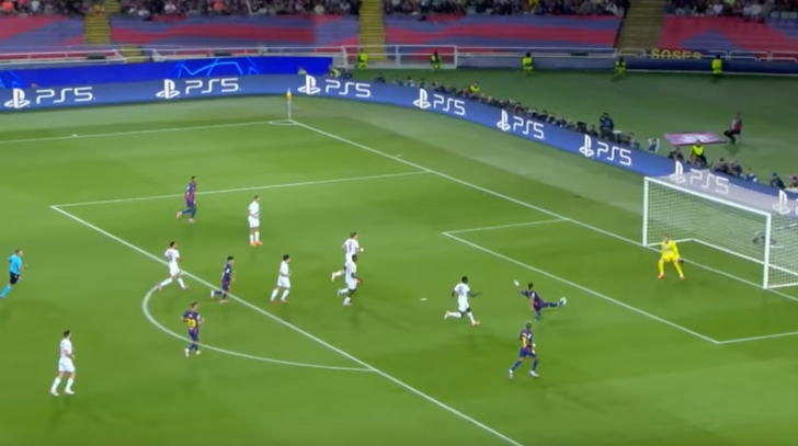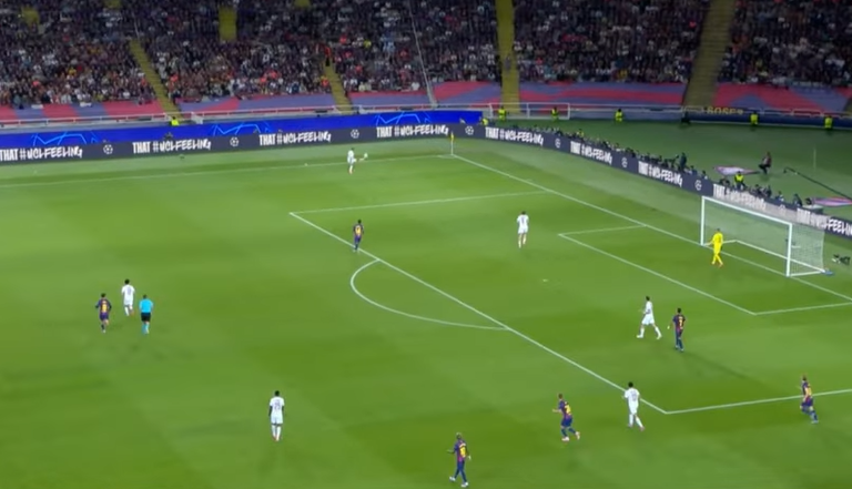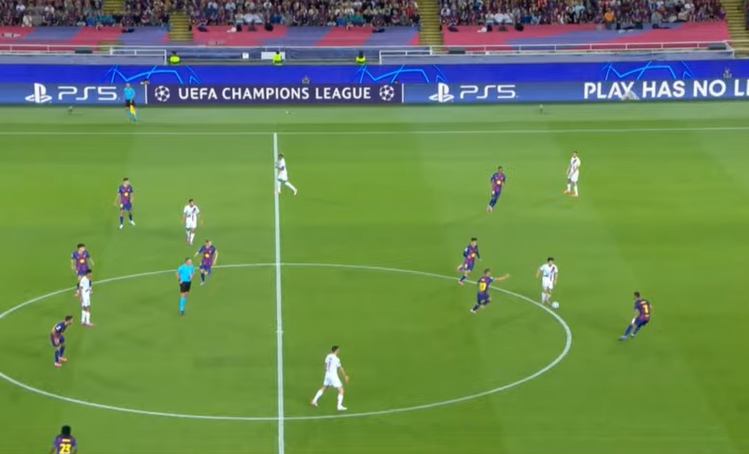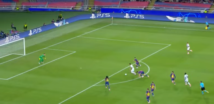 But the msot crucial rotations are also happening at the back. Martin breaks off the defensive line to pick up the fullback and Cubarsi shifts over to pick up PSG's right winger. This leaves the back line in a 3 v 3 but it will be difficult from PSG to create from this position as there are no players in support.