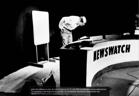 La bobine du reportage se bloque. À ce moment, Christine Chubbuck déclare face à la caméra « Pour rester fidèle... aux pratiques de WXLT qui consistent à vous informer le plus immédiatement et complètement des toutes dernières nouvelles locales avec du sang et des tripes, TV 40 présente ce que l'on pense être une première télévisée. En couleur, couverture exclusive d'une tentative de suicide. (In keeping with the... WXLT practice of presenting the most immediate and complete reports of local blood and guts news, TV 40 presents what is believed to be a television first. In living color, exclusive coverage of an attempted suicide) ». Elle sort un revolver de son sac à main et se tire une balle dans la tête, derrière l'oreille droite et son corps bascule immédiatement et violemment vers l'avant sur le plateau du bureau derrière lequel elle est assise. Le directeur technique fait rapidement un fondu au noir. Dans l'instant, plusieurs employés pensent que c'est un gag de mauvais goût avant de très vite réaliser la gravité de la situation.