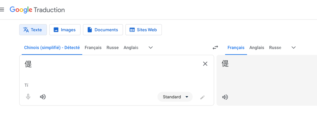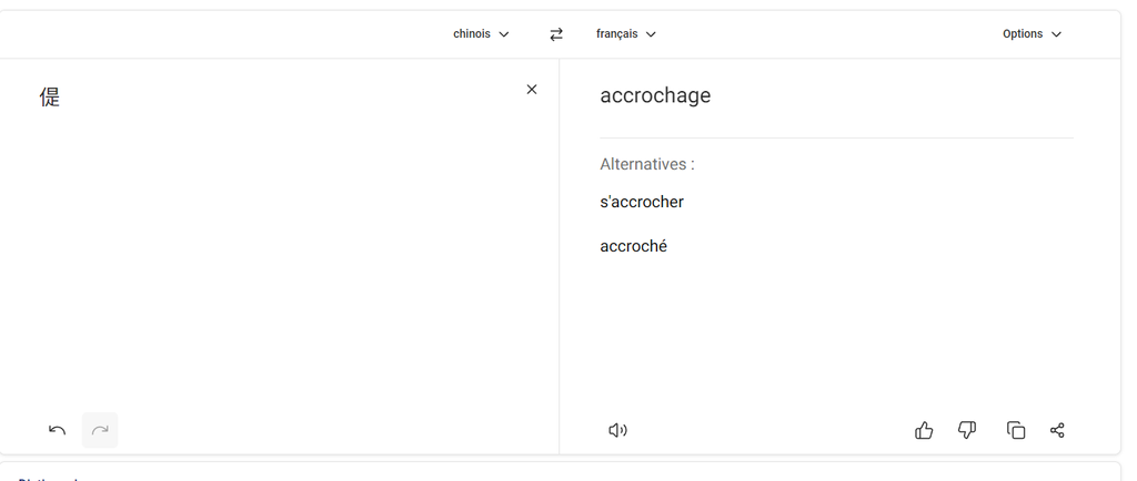 À noter que 偍 n'est traduit de la sorte que sur la page de résultats. Si on se rend sur translate.google.com, le traducteur ne nous donne tout simplement pas de résultats comme pour les autres idéogrammes dont il ne connaît pas la traduction: