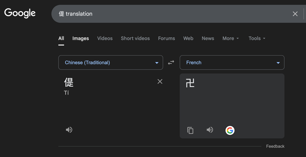 À priori tout à fait banal, 偍 cache en fait quelque chose d'assez étrange: si vous essayez de le traduire via l'intégration Google Translate à la page de résultats, vous obtiendrez un swatiska en output, peu importe la langue que vous choisissez. Pas le mot "swastika" mais bel et bien le symbole 卍 comme vous pouvez le voir ici: