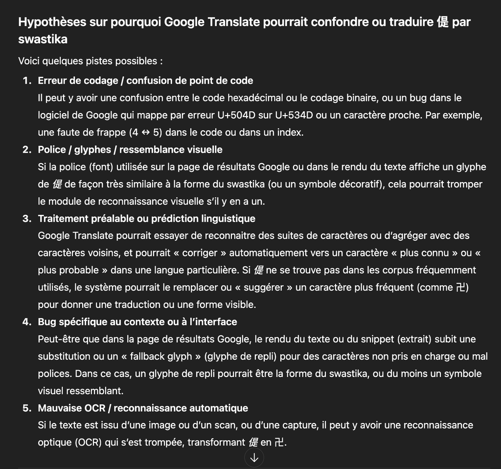 ChatGPT suggère un bug dû à une ressemblance visuelle entre les idéogrammes 偍 et 卍. Je ne sais pas comment fonctionnent ces programmes mais j'ai vraiment du mal à concevoir comment un algorithme pourrait les confondre: pas le même nombre de traits, constructions différentes, sens littéraux très distincts,... Le seul argument qui pourrait potentiellement me faire pencher vers cette hypothèse c'est la relative proximité entre les 2 idéogrammes dans la table Unicode. Mais pourquoi ce caractère là en particulier (il y en a d'autres plus proches)? Et pourquoi un tel bug n'aurait jamais été rapporté? C'est pas convaincant du tout.