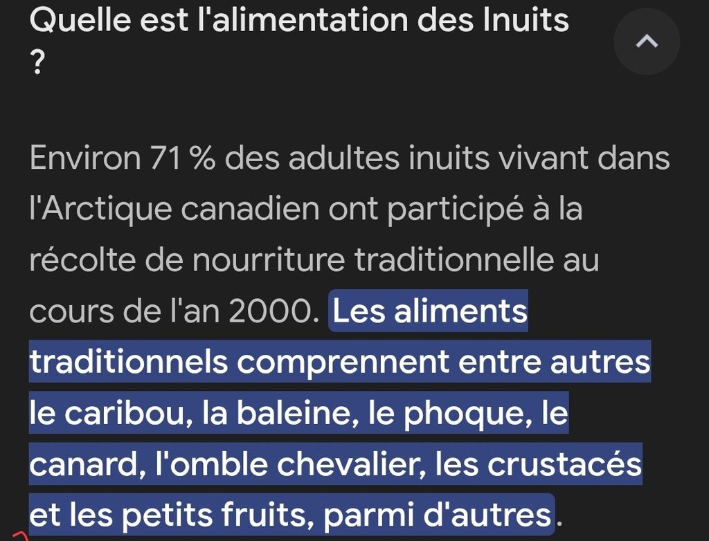 En résumé, oui, traditionnellement, les Inuits mangeaient souvent leur viande crue ou peu cuite, ce qui fait partie intégrante de leur mode de vie et de leur adaptation à leur environnement.