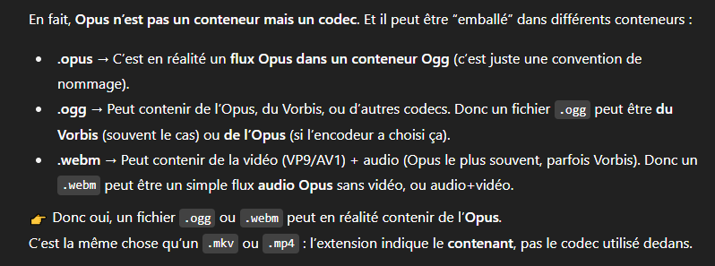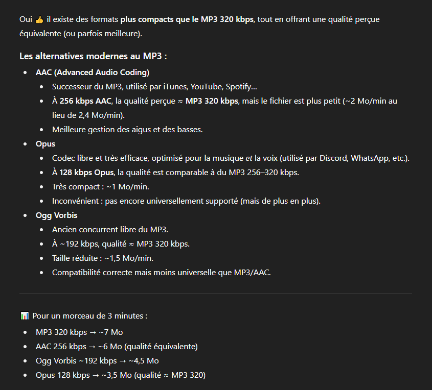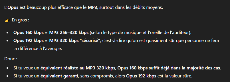 Et ces formats sont en réalité égaux à du mp3 320kbps, enfin théoriquement l'opus doit être à 192kbps pour égaler parfaitement le mp3 320kbps mais déjà en opus 160 kbps, il en est très proche en réalité la différence est quasiment imperceptible :