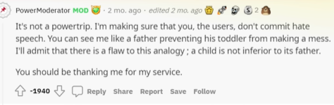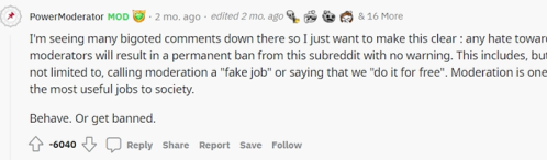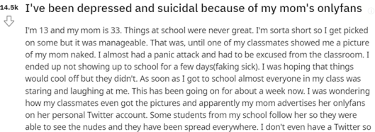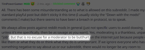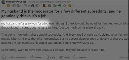 The corruption of the mind to carve into primal instincts. Someone's brain that is foggy tend to forget the consequences. If you mod more than 1 subreddit especially, being mod can take you a lot of times. TrueOffMyChest is a subreddit where people anonymously rant about whether is it. It's usually a recipe for bad things. It gets funny whens omeone explains in a post that her husband is mod in a few different subreddits, thinks it's a job and refuses to look for a job. The answer from a moderator saying that any insult to moderators will be banned, just like calling moderator a fake jub or useless, saying it's one of the most usefull to society. Some moderators spend their time online, thinking the world revolves around internet. This comment has been eventually changed to reflect the opinions of subreddits moderators. This comment confirmed that the previous post was real. Redditors love sex workers because of the first word of the title. It starts with someone saying to be 13 years old and having his mum working on OnlyFans who allegedly told that her job was no different from a job at grocery or at bank. The child is trapped as he can't escape the torment from his classmates.