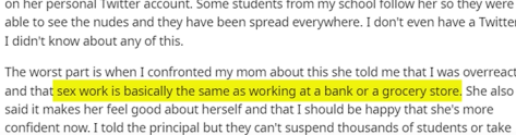 Getting a family cousneling, contact the school administrator, a lot of things can be done. But one thing to not do is to listen to the average reddit degenerator. To some degenerate, sex work is sex work, even if it's ruining someone son's life.
