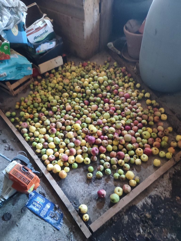 1 sac et demi , de pomme ramassé environs, des pommes justes tombé au sol, la semaines prochaine j'irai ramassé celle dans les arbres et celle qui seront tombé par terre, je pense ramassé 3 sac voir 4.