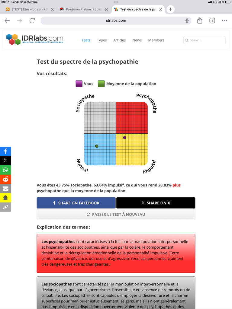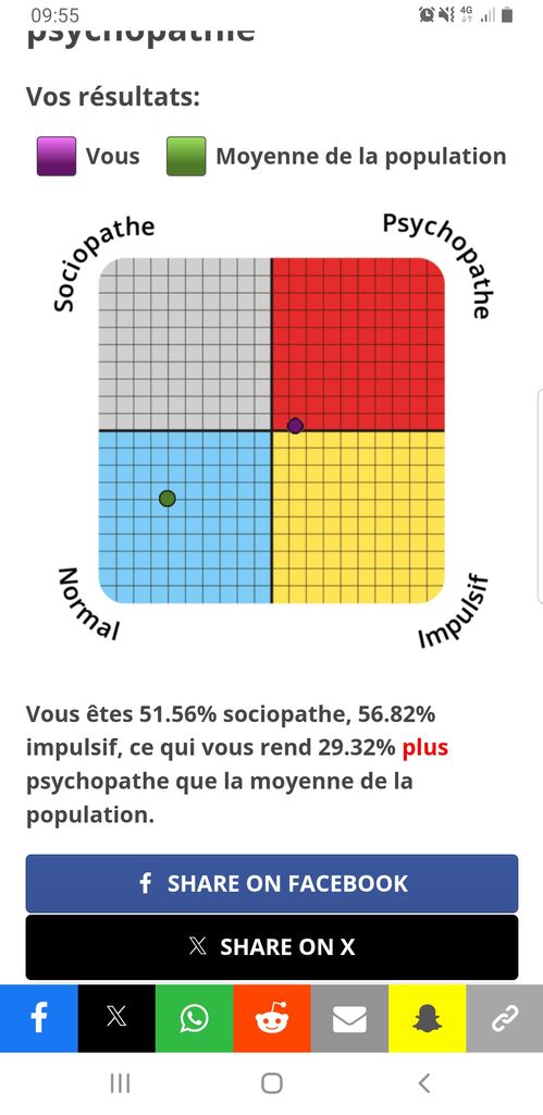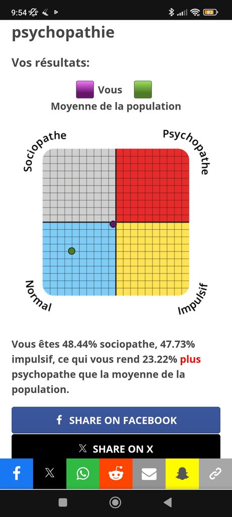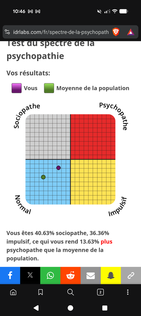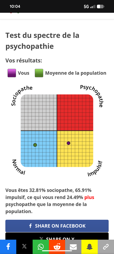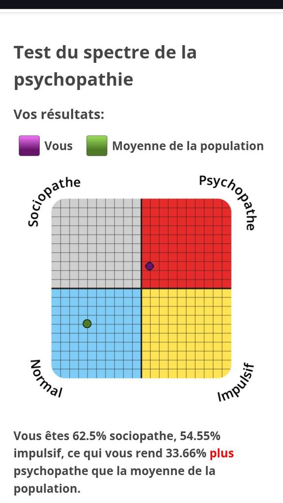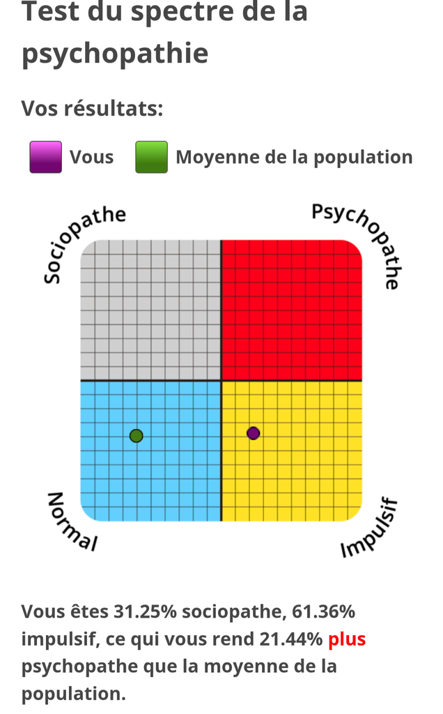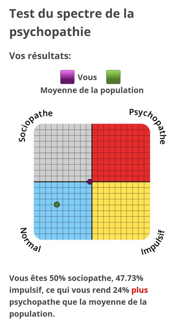 "Vous êtes 12.5% sociopathe, 31.82% impulsif, ce qui vous rend 2.71% moins psychopathe que la moyenne de la population."