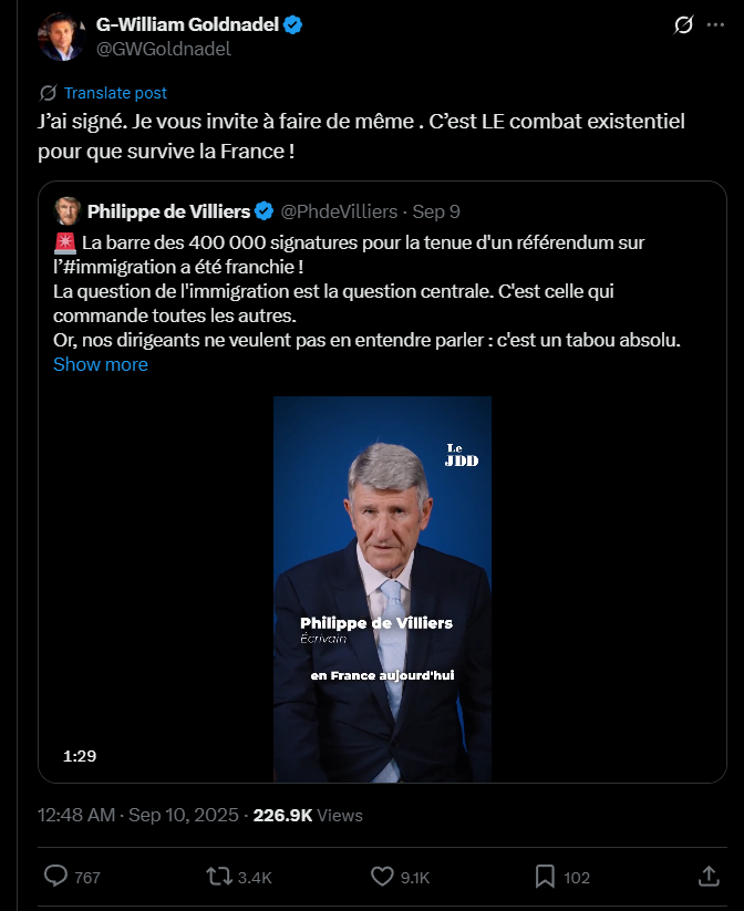 Mais il faut comprendre qu'aujourd'hui la séparation se joue sur les cosmopolites sans frontièristes (immigrationnistes) et les identitaires (anti-immigration).
