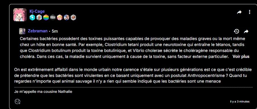 On est extrêmement affaibli dans le monde urbain notre carence s'étale sur plusieurs générations est ce que c'est crédible de prétendre que les bactéries sont virulentes en ce basant uniquement avec un postulat Anthropocentrisme ? Quand tu regardes n'importe quel animal sauvage il n'y a rien qui semble indiqué que les bactéries sont une menace