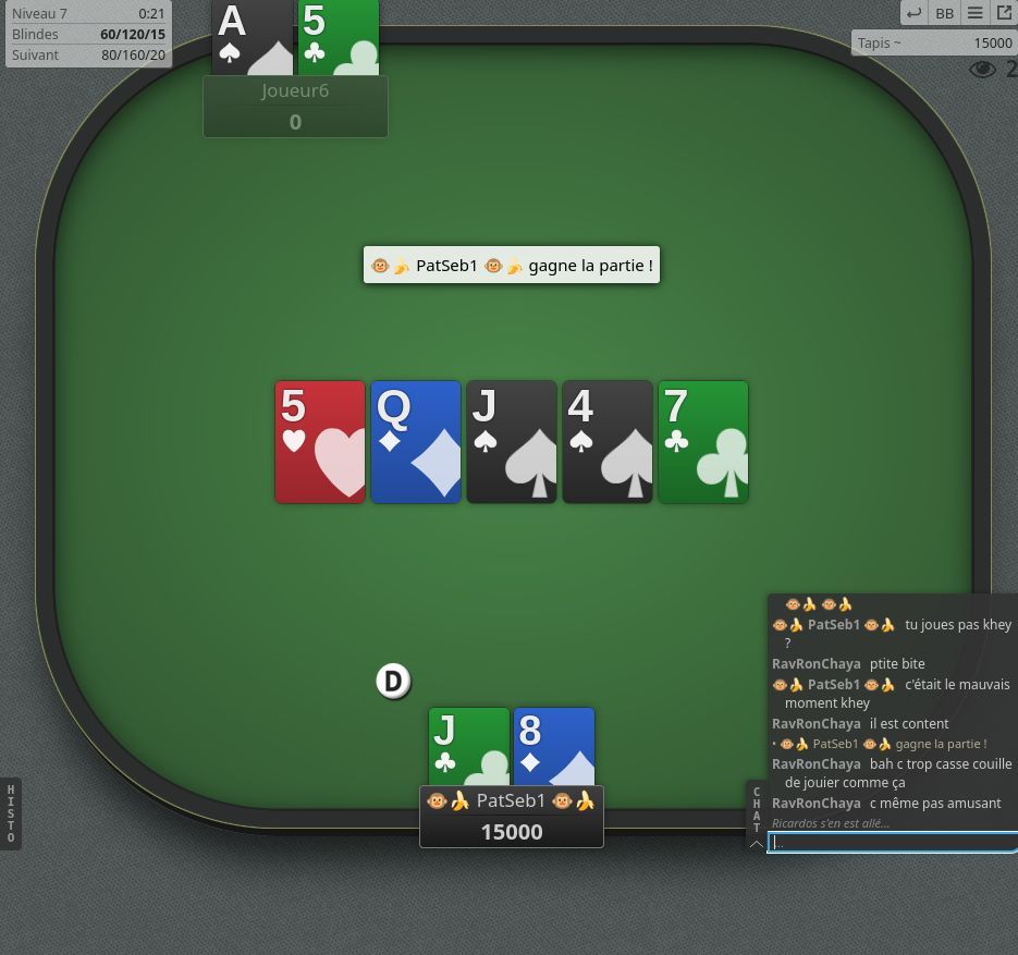 3ème : RavRonChaya concassé par 🐵🍌 PatSeb1 🐵🍌 avec Double Paire Dame et Deux Hauteur Roi contre Hauteur Roi à l'issue de la manche n°42