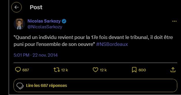 Nicolas Sarkozy @NicolasSarkozy "Quand un individu revient pour la 17e fois devant le tribunal, il doit être puni pour l'ensemble de son oeuvre" #NSBordeaux 5:01 PM · 22 nov. 2014