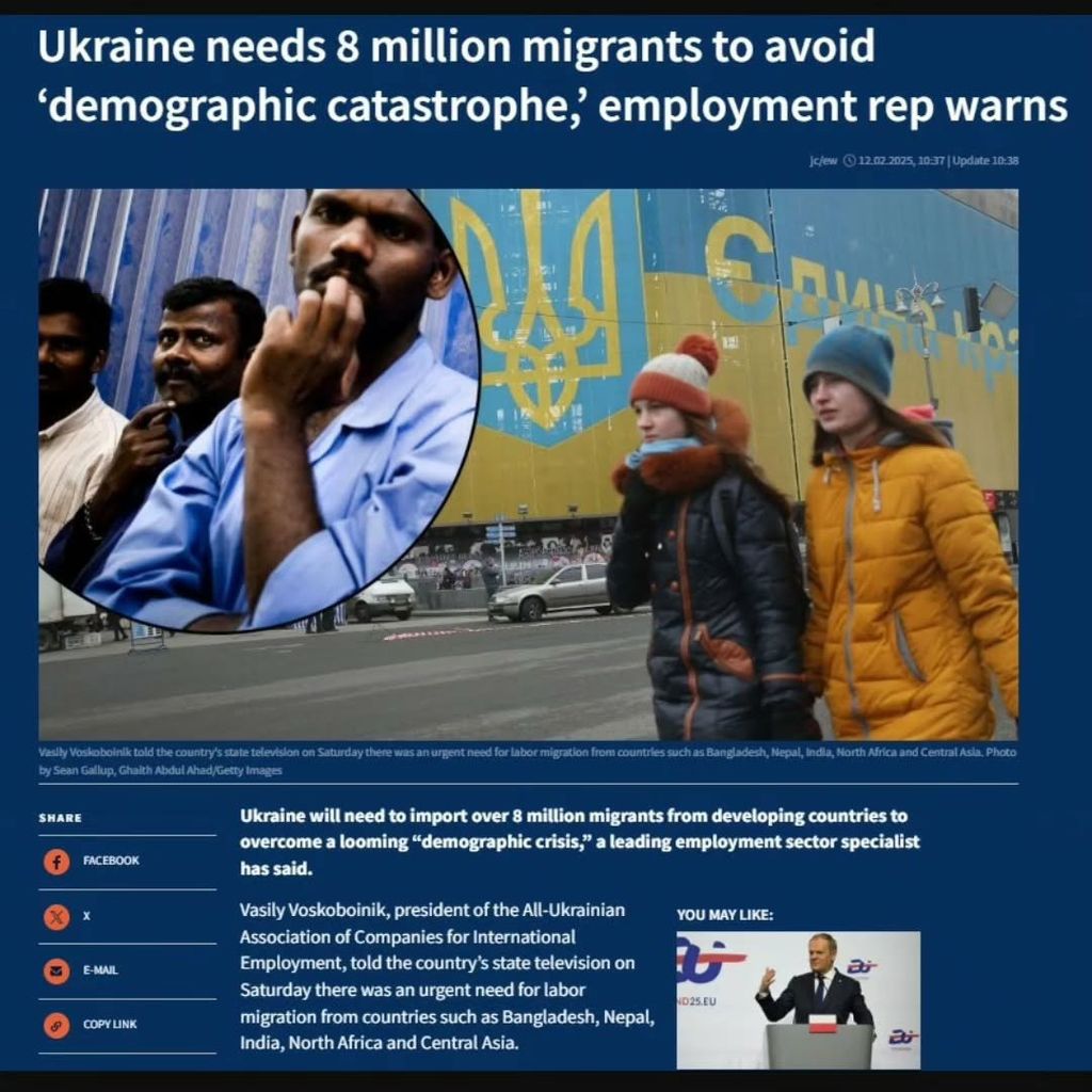 Selon Vasily Voskoboinik, président de l’Association ukrainienne des entreprises d’emploi international, l’Ukraine a un besoin urgent d’importer plus de 8 millions de migrants pour pallier une crise démographique imminente