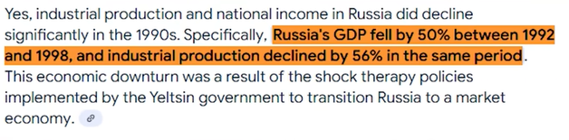 Soviet Union dissolved in 1991 after practically all its constituent republics declared independence. Russia was one of these countries turning a new leaf from the Soviet system and ready to try something new. Boris Yelstine led the country from 1991 to 1999. He had a vision to pursue friendly relationships with the US and end hostilities with NATO. He belived that under his leadership, Russia would be welcomed by the Western world. He thought this would lead to a new age of prosperity in Russia. But reality ended up being extremely different. Dissolution of Soviet Union left Russia in very weak diplomatic and economic position. In 1992, the Russian jewish politician Yegor Gaidar became prime Minister. He pledged to improve the Russian economy through a mass economic privatization policy known as the Shock therapy. Russia's states industries and social programs were to be rapidly liquidated and sold the the highest bidder. The plan was endorsed by the international monetary fund, the US treasury, and the Bill Clinton administration. As shock therapy was implemented, Western financiers and oligarchs with ties to organized crimes used international banking loans to buy out Russian companies at dirt cheap prices. At the same time, Russia was undergoing inflation that depressed the wealth of native Russians meaning they couldn't realistically compete for shares of the pies. As a result many call this period the looting of Russia. Not only shock therapy didn't improve the Russian economy, Russia entered a full blown state of crisis. In the 1990s, Yeltsin, Gaidar and other US supported politicians Russia's industrial production and national income declined by half.
