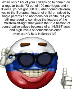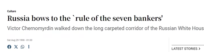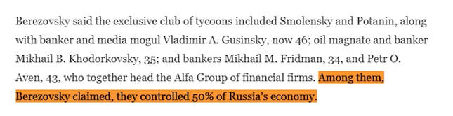 This meme stating many negative statistics about Russia is actually citing statistics from the 1990s, many of which have drastically improved in Russia since then. Nevertheless, it does show how rough it was in Russia during the 1990s. In 1996, the Russian jewish oligarch Boris Berezovsky openly boasted in an interview that he and 6 other bankers controlled over 50% of the Russian economy and most of the country's mass media.