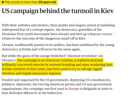 " US compagin behind the turmoil in Kiev " And the Guardian was a journal that was pro color revolutions. Viktor Yushchenko came to power after the orange revolution. He was in power during 5 years. This was setting the tone for future regime changes in the region.