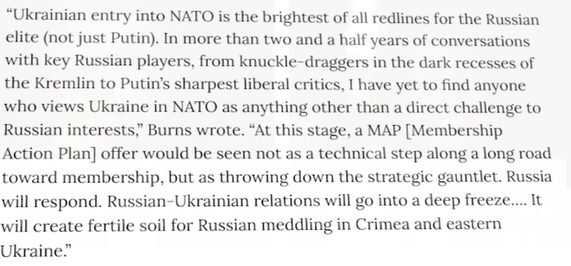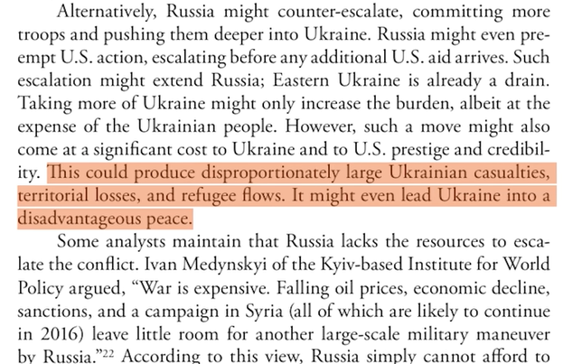 In the report section about Ukraine, it states in the risk section that Ukrainians could suffer immensely from America getting further involved in the region. By the time the 2020s rolled around with Ukraine actively funded and armed in their war against the ethnic Russians, this was the moment the Russians decided they had to go to war against Ukraine. In 2025 New York Times released an article detailing how since 2014, NATO military officials were directly training and arming the Ukrainians military.