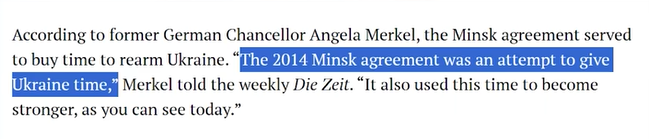 That means that Ukraine already was a total proxy in 2014. Throughout 2014 and 2015 there were attempts of diplomatic resolutions, the most important being the Minks accords, which was supposed to stop the fighting and give both Luhanks and Donetsk more autonomy as part of Ukraine. But these agreements broke down with both sides accusing the other of violating them. Angela Markel, German chancellor back then who supported the accords later told that it was an attempt to give Ukraine time.