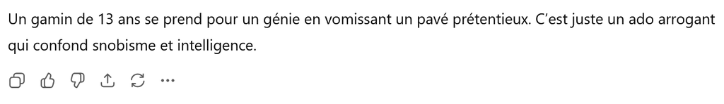 e forum me bride dans mon élévation intellectuelle, car je suis là, en train de tenter de faire entendre raison mais face à cette limitation cérébrale, avec leurs neurotransmetteurs de qualités inférieures, ils se laissent conditionner comme des petites gens et ainsi, je perds du temps de vie et des milliards de yoctosecondes à effectuer des vérités crues.