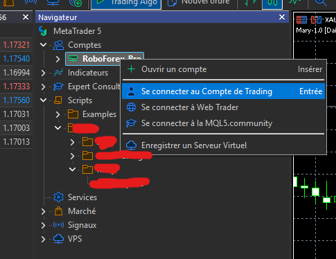 Dans la fenêtre "Navigateur" il faut connecter votre compte de trading