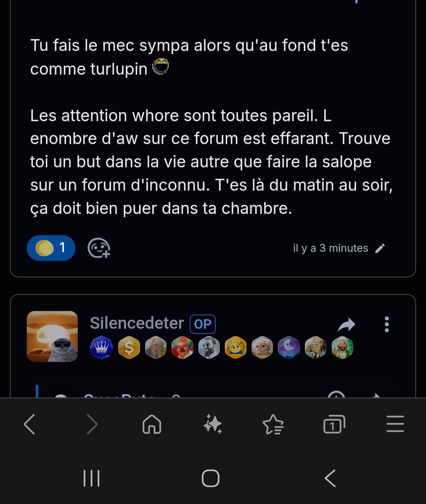 Je ne suis pas un toujours si bien, j'ai mon caractère mais je n'attaque jamais dans le dos. Je reconnais aussi un coté attention whore avec ce topic, mais c'était surtout pour afficher la lacheté du bonhomme