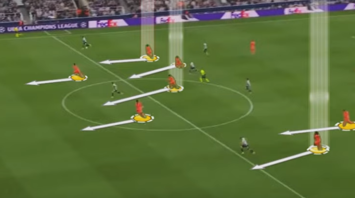 It means PSG can move into midfield and force Barcelona back into a zonal marking system. Having the fullbacks stay wide helps circulate possession around the back and opens these pockets of space in the center for the 2 pivots to get on the ball. Something we see consistently both at Barcelona and PSG. And if the opposition gets to aggressive clowing down the fullbacks, then it opens up these 2 gaps mentionned earlier : in front of othe defense, or in behind.