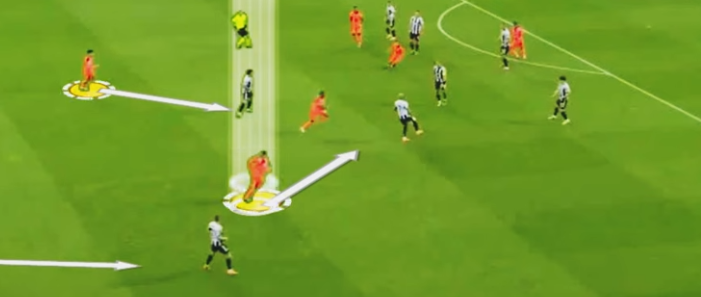 They now have a clear advantage but Barcelona do the same thing. The team switch from zonal to man marking as soon as the pass to the goalkeeper is triggered.