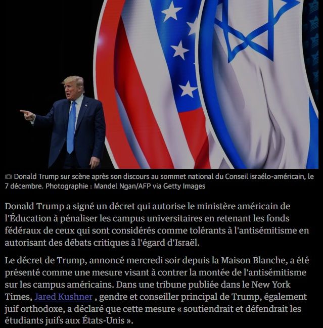 Donald Trump a signé un décret qui autorise le ministère américain de l'Éducation à pénaliser les campus universitaires en retenant les fonds fédéraux de ceux qui sont considérés comme tolérants à l'antisémitisme en autorisant des débats critiques à l'égard d'Israël.