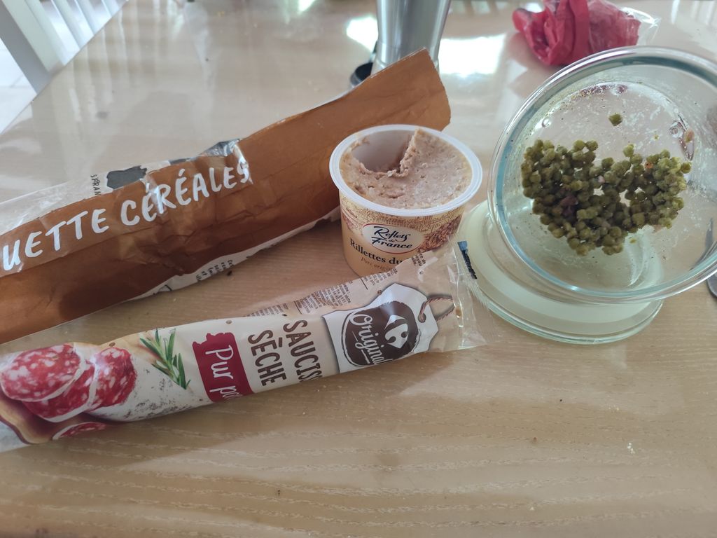 On a pris le même pain, il me restait des petits pois lardon crème fraîche j'ai pris un peu de saucisson et de rilette pour accompagner ça !