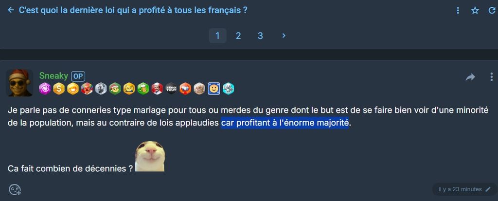 Je parle pas de conneries type mariage pour tous ou merdes du genre dont le but est de se faire bien voir d'une minorité de la population, mais au contraire de lois applaudies car profitant à l'énorme majorité.